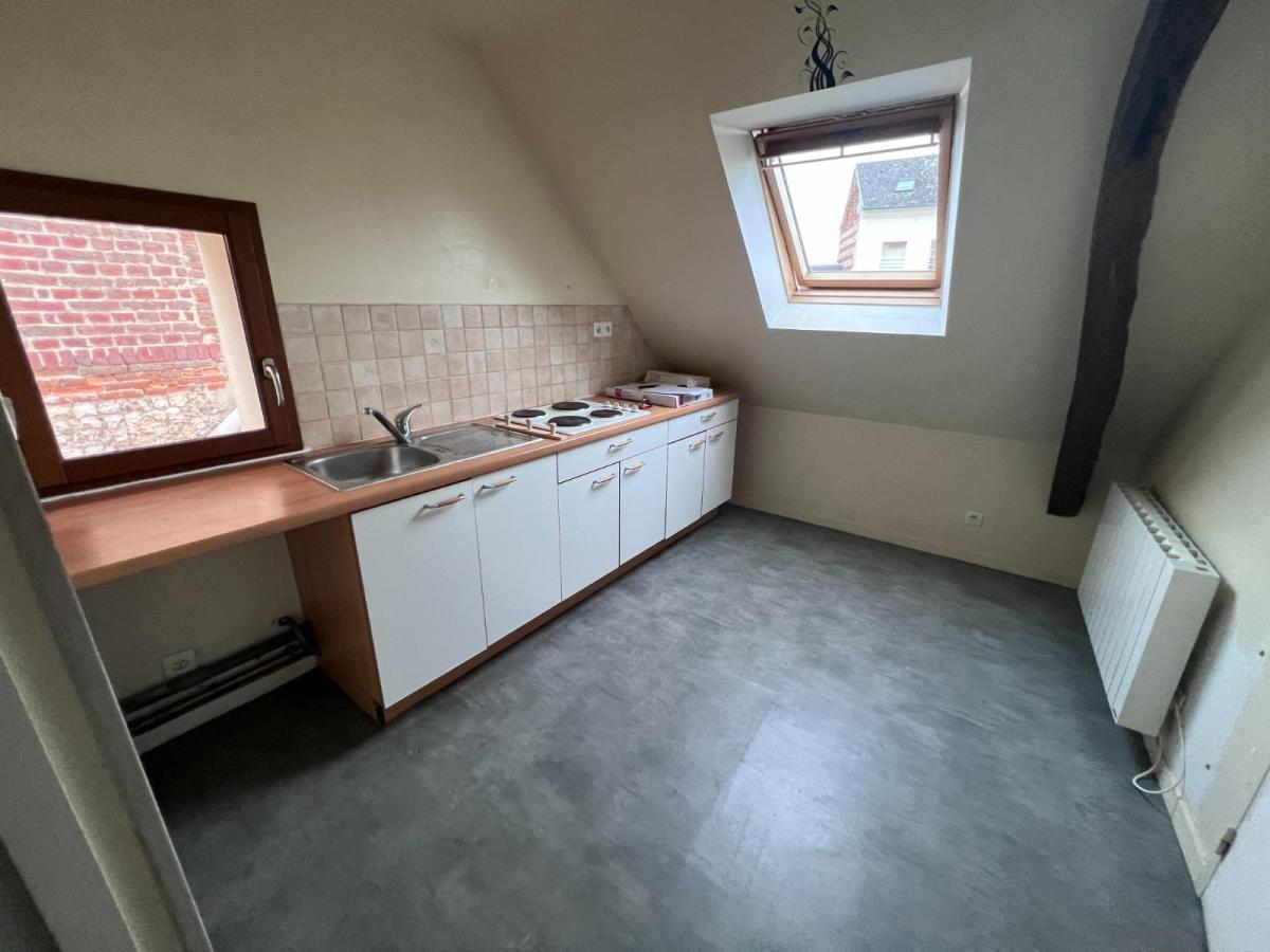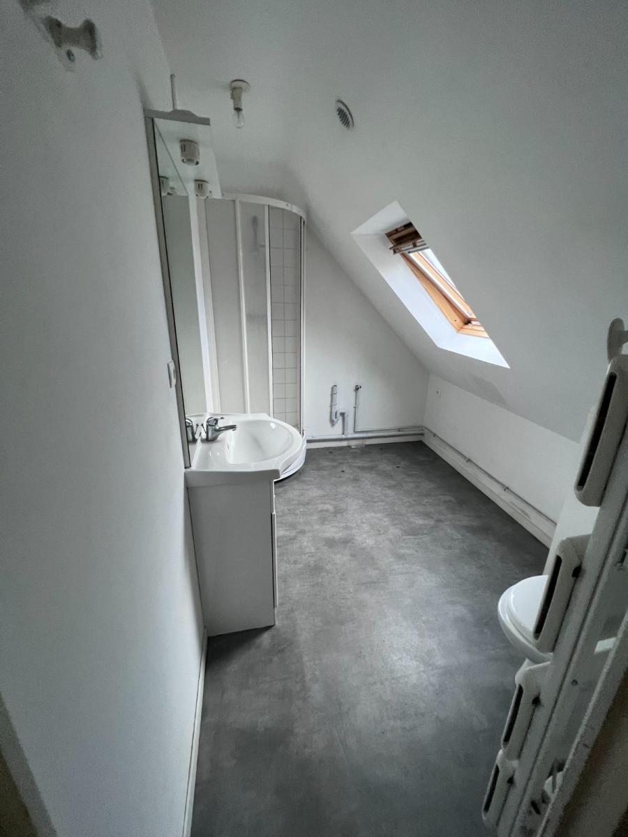 GODERVILLE PLEIN CENTRE, appartement sous comble de deux pièces, comprenant un espace salon, une cuisine meublée, une salle de douche avec WC, et une chambre.L'ensemble est récent.