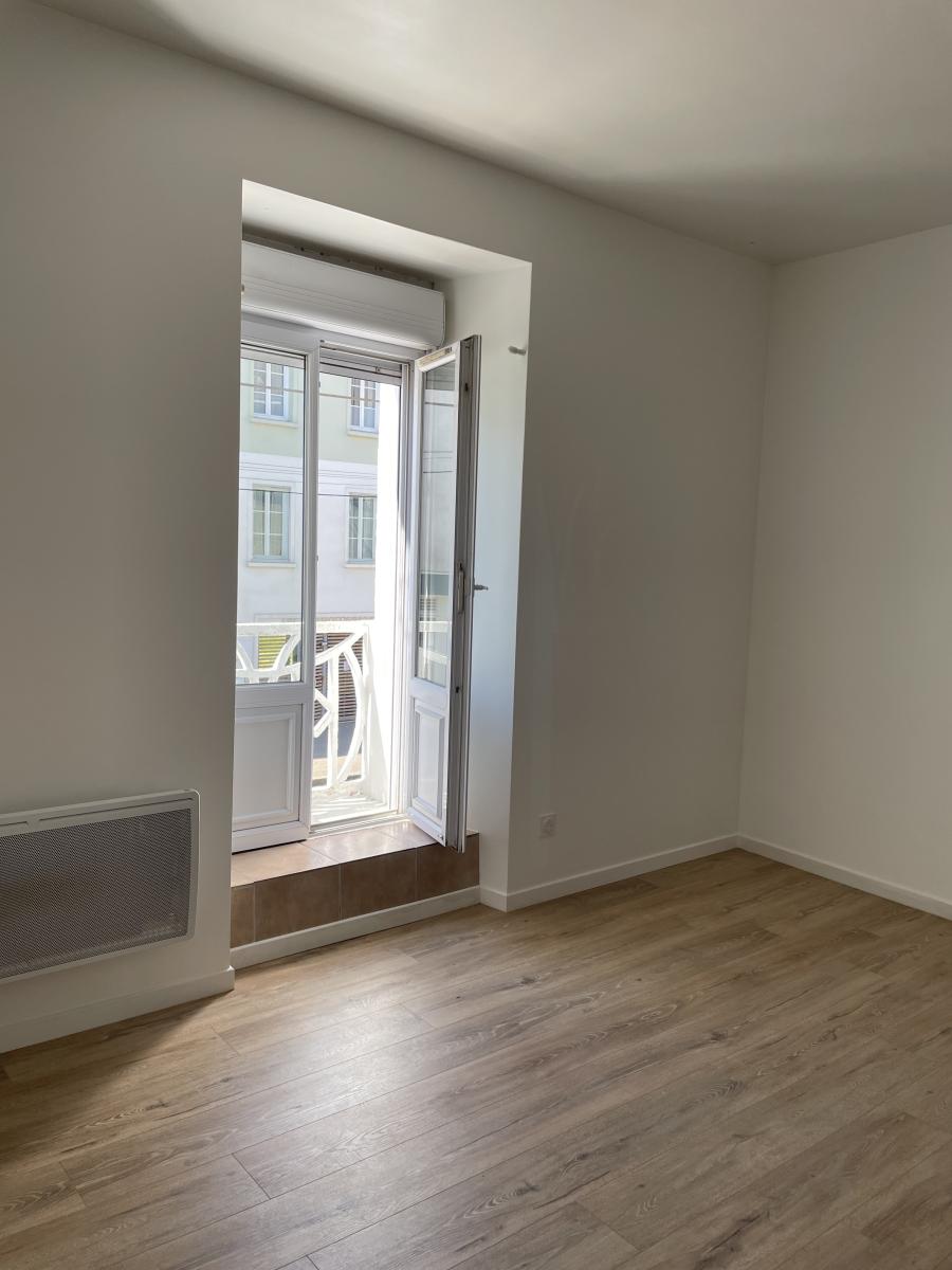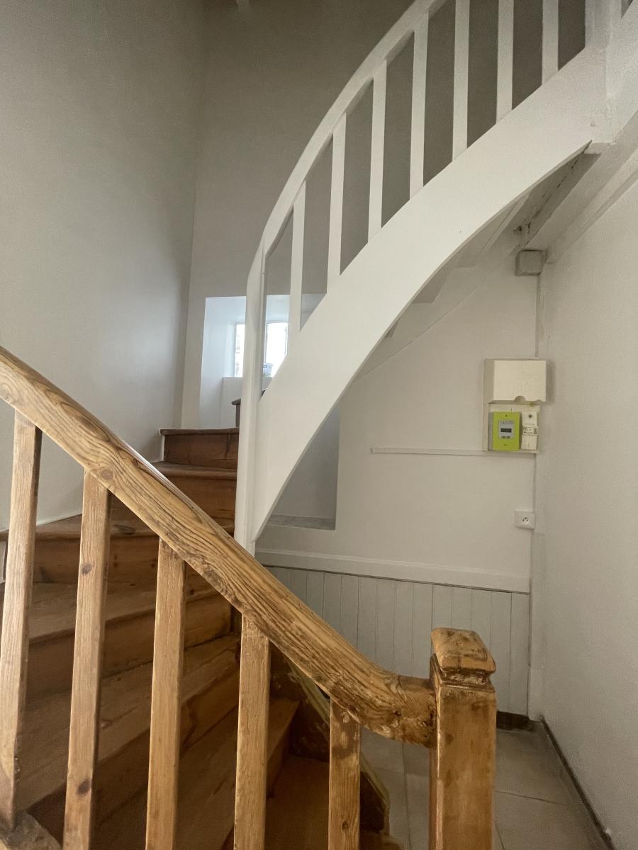 Appartement T2 situé au 1er étage avec accès indépendant, comprenant une entrée avec escalier menant au logement, un séjour avec cuisine ouverte aménagée, une chambre, ainsi qu’une salle d’eau avec WC.