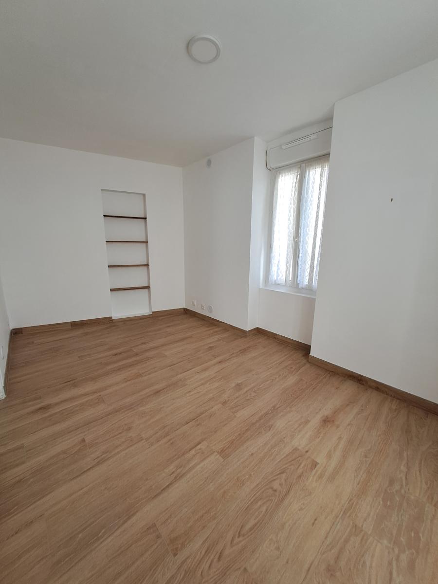 Deux chambres : l’une avec placard intégré, l’autre équipée d’étagères murales en bois.