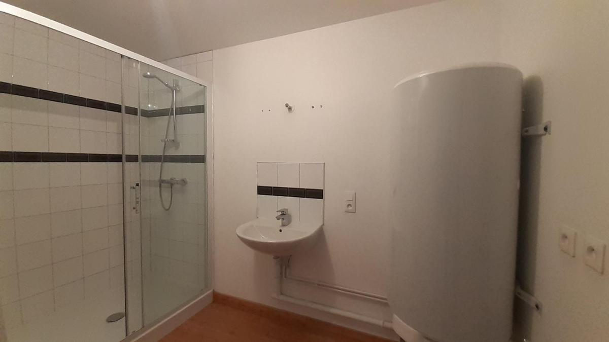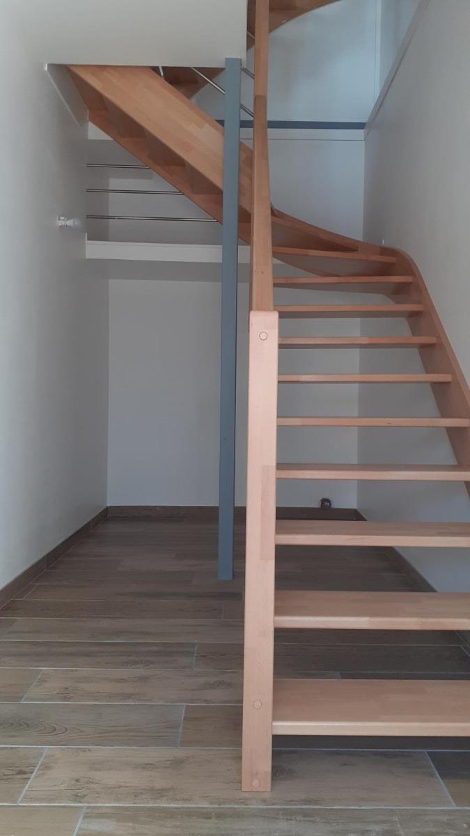 - 1er étage : séjour avec cuisine ouverte et rangement, bureau, salle de douche, W.C, chambre,