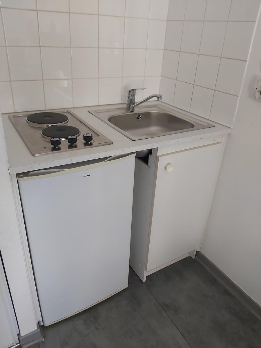 Entrée avec placard, séjour avec placard et coin cuisine, salle de bains avec douche et WC, placard.