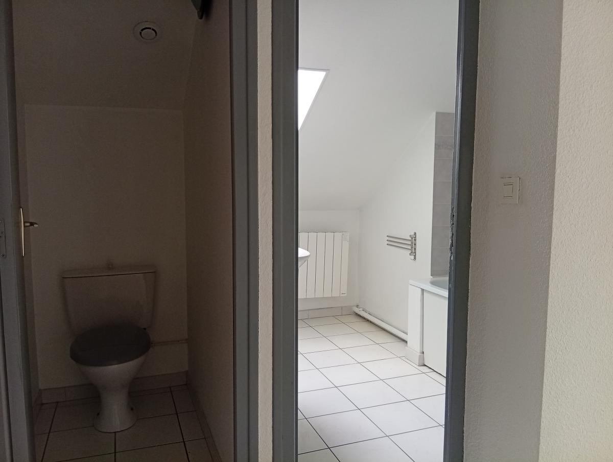 Marne (51100) à Reims, Rue Ernest Renan, Quartier Clairmarais, appartement de type 2 sous les combles, non meublé dans immeuble ancien en très bon état, situé au 4ème étage sans ascenseur d'une petite copropriété calme, comprenant : entrée dans une pièce de vie avec coin cuisine meublée et équipée (frigo et plaques de cuisson) , une salle de bain (baignoire et lavabo) , toilette séparé et une chambre.