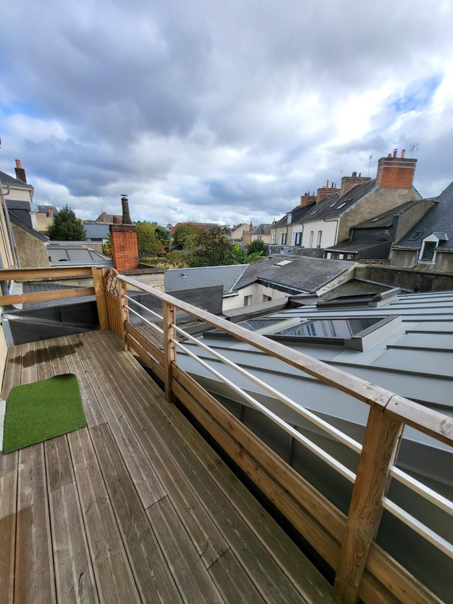 Séjour avec coin cuisine équipée, salle d'eau avec WC, chambre et terrasse