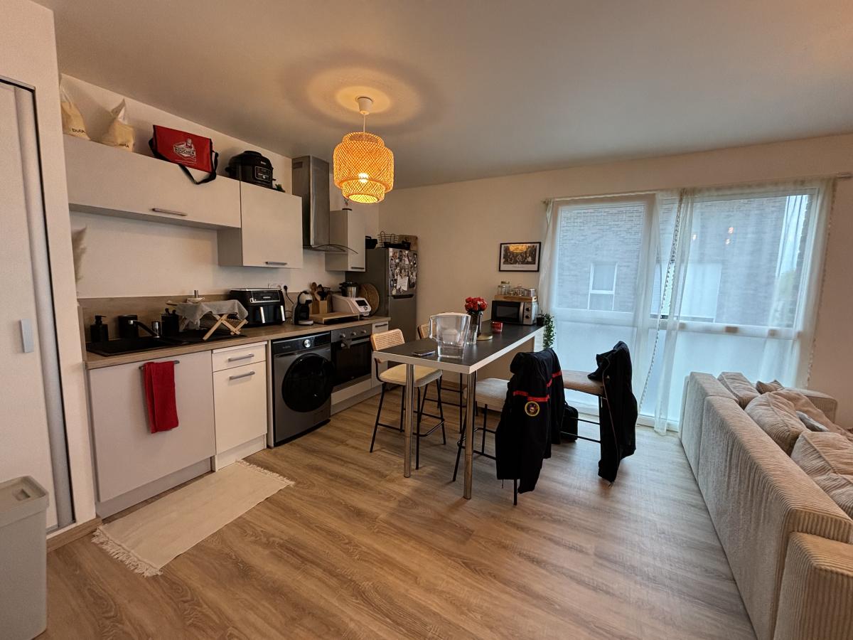 A louer Appartement T2 situé au 2éme et dernier étage sans ascenseur dans la résidence neuve " L’Échappée verte" à proximité du CHU comprenant: une entrée avec placard, une chambre de 11 m², un séjour avec coin cuisine aménagée et équipée ( plaque, four hotte) de 25 m², une salle d'eau avec w-c.