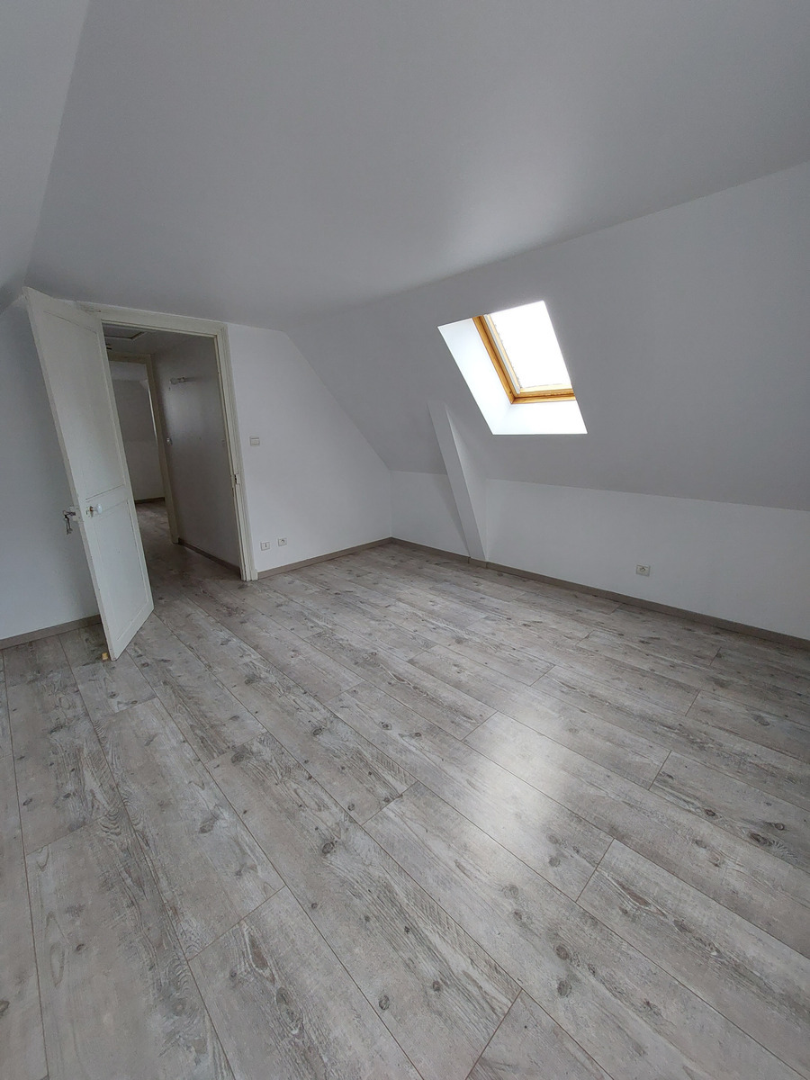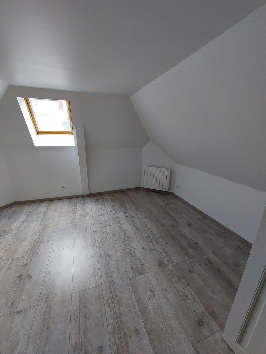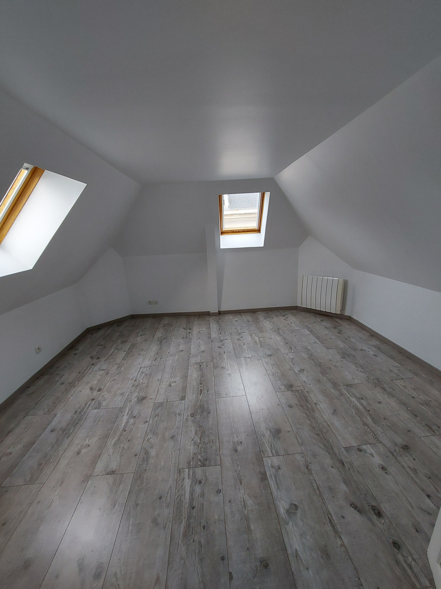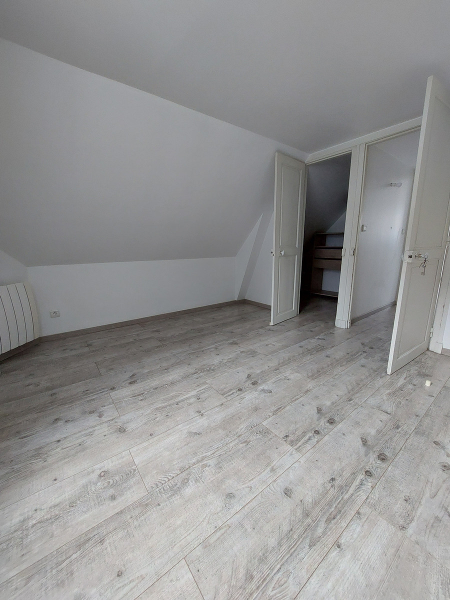 A LOUER à REIMS (51100) Dans une résidence de standing, un appartement T3 en triplex, avec entrée privative, comprenant au rez-de-chaussée un sas avec placard menant au 1er étage lequel desserre une salle de bain, un WC séparé, un grand placard, un séjour, une cuisine meublée et partiellement équipée (plaques, hotte) - au 2ème étage: 2 chambres sous pentes dont une avec dressing (surface au sol : 13,75 m² et 16,60 m²).