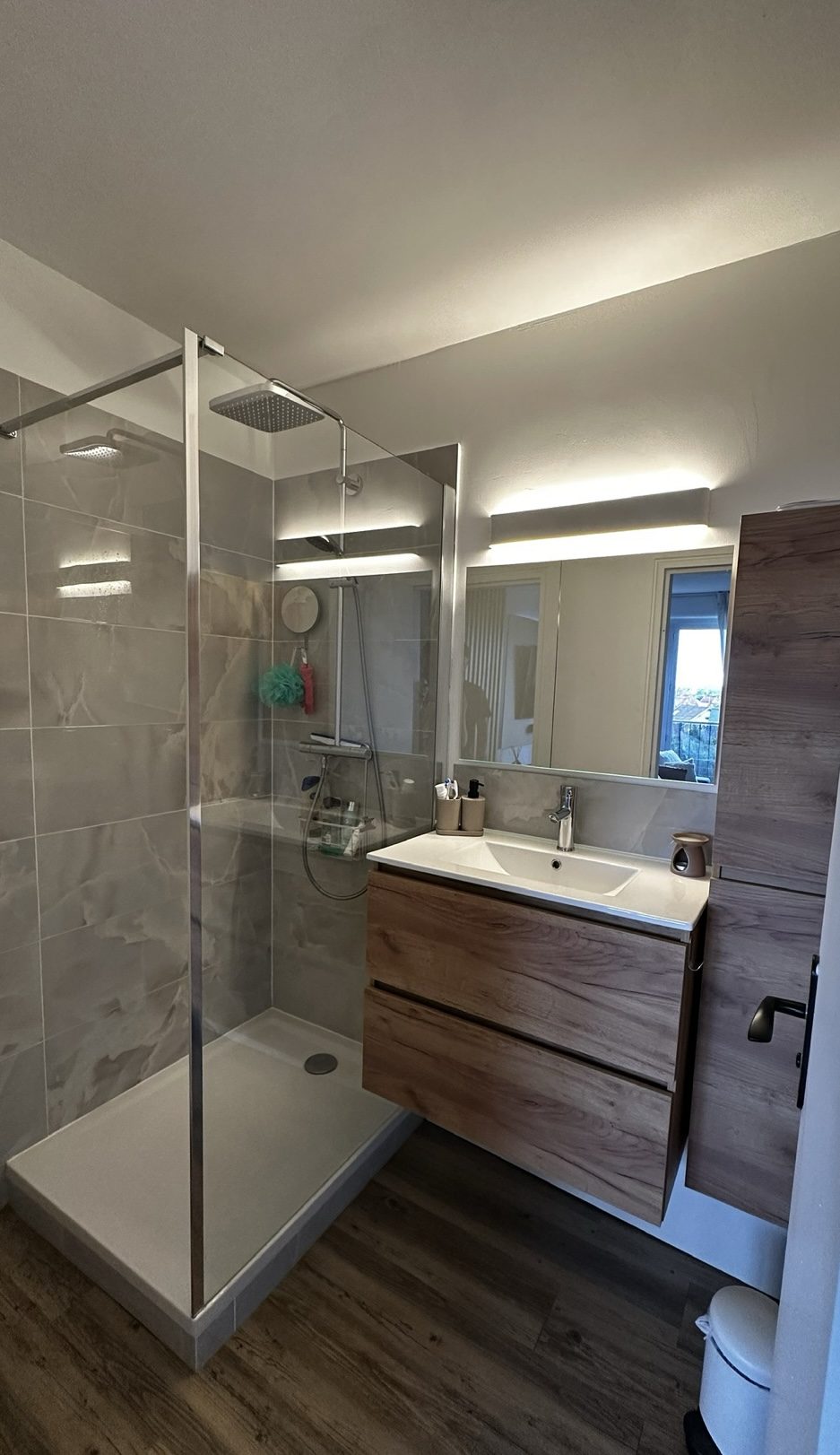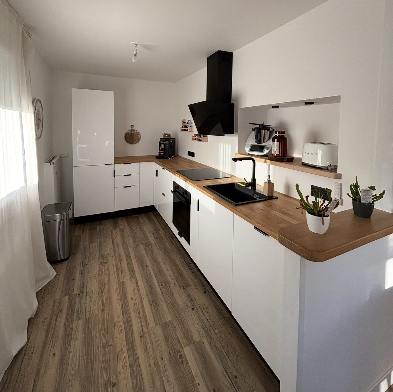 Une cuisine aménagée et équipée ouverte sur séjour-salon, un cellier-buanderie, deux chambres, une salle de bain avec douche, wc séparé.
