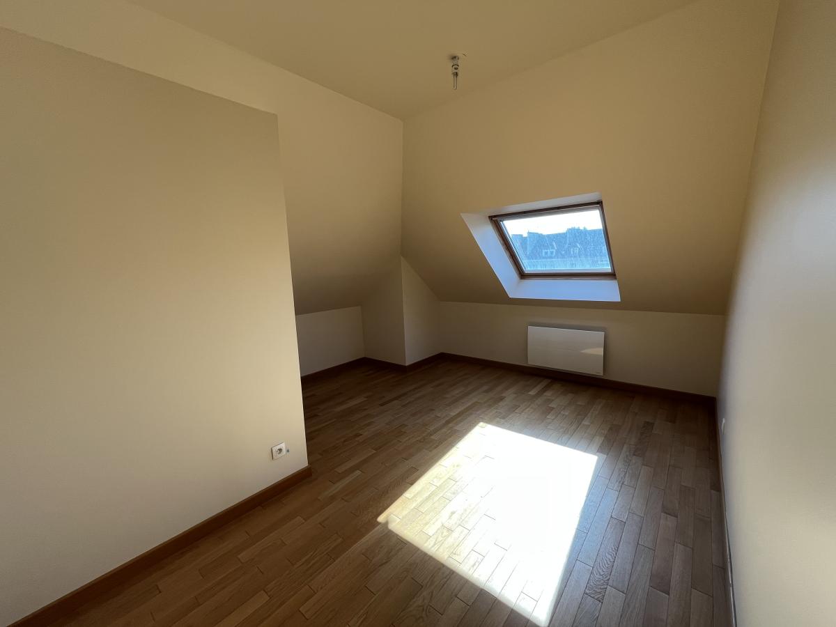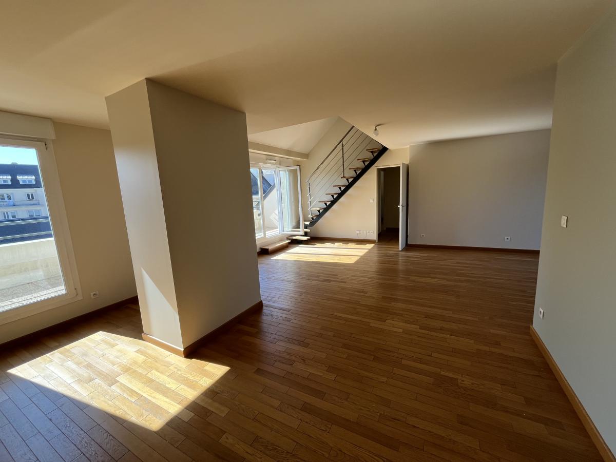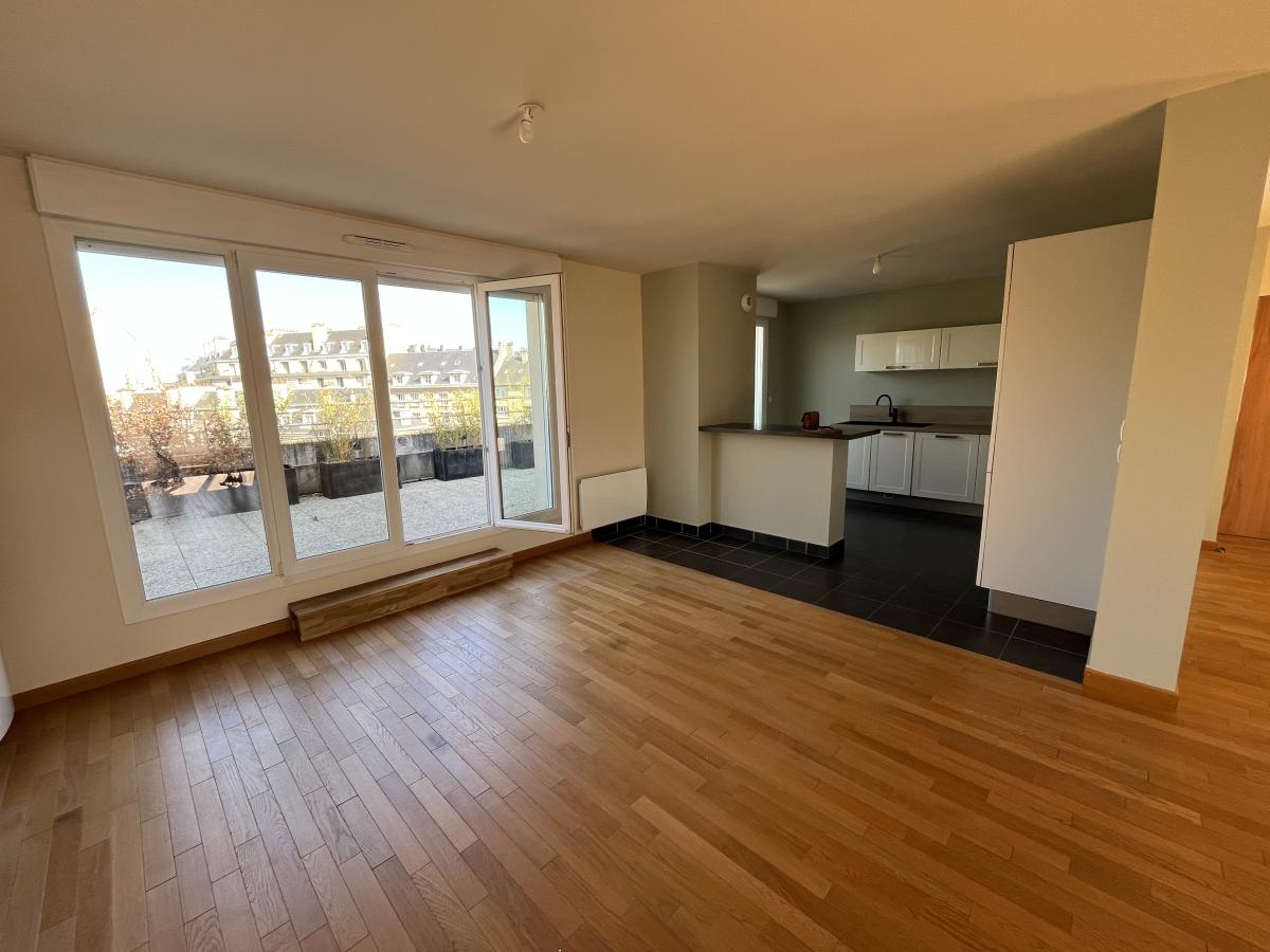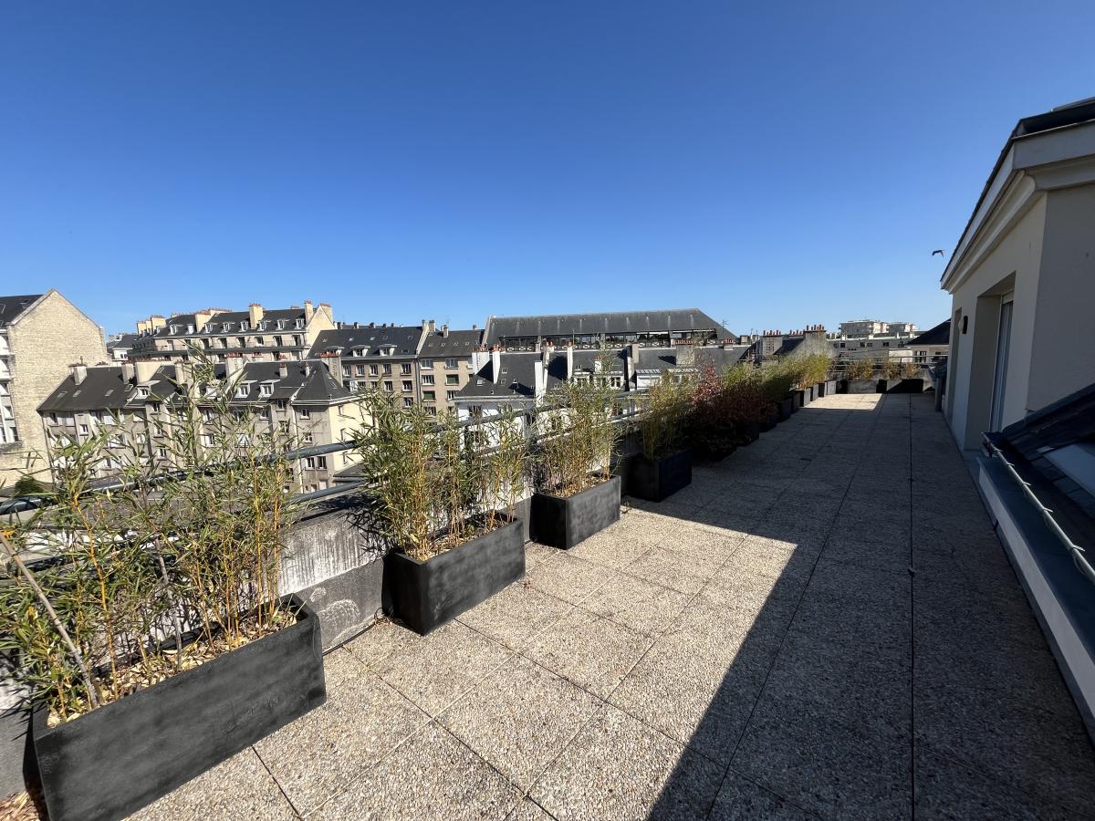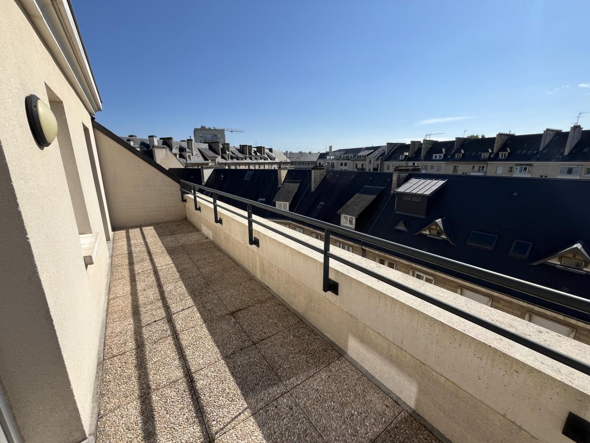 Appartement F5, parfait état, Caen Centre proche hippodrome, dernier étage avec ascenseur, deux terrasses, comprenant séjour, cuisine aménagée et équipée ouverte, trois chambres, un bureau en mezzanine, salle de bains.