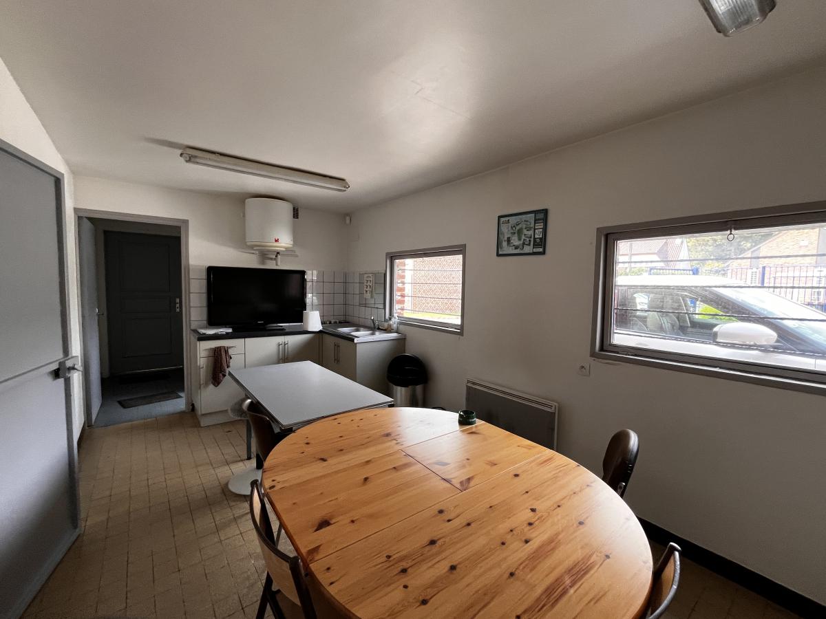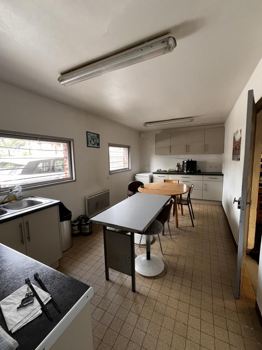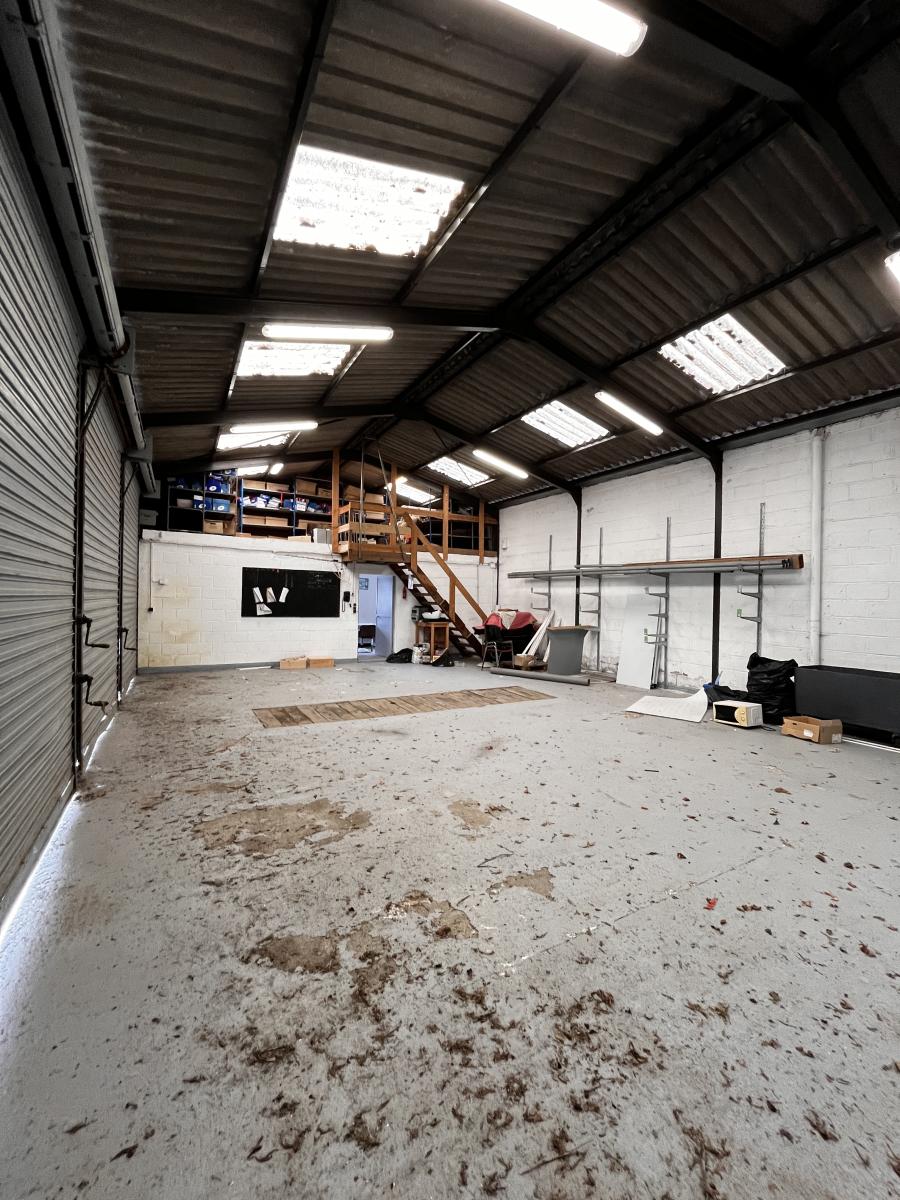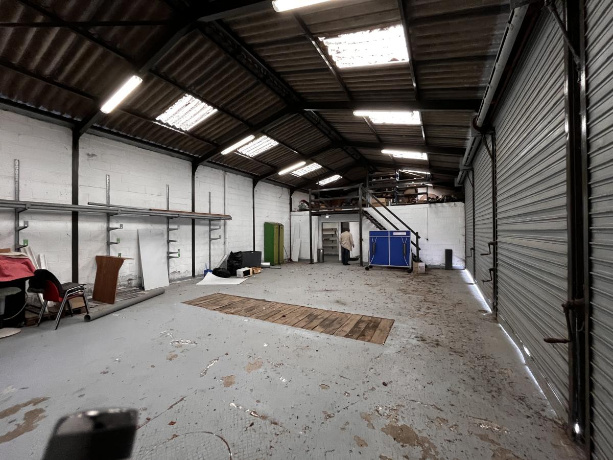 Dans un ensemble immobilier, bâtiment industriel d'une superficie de 250 m² environ comprenant : un entrepôt avec fosse et rideaux métalliques; un premier local avec toilettes, une pièce avec lave mains, dégagement, un réfectoire, une mezzanine servant de stockage; un second local composé de quatre pièces et une mezzanine servant de stockage