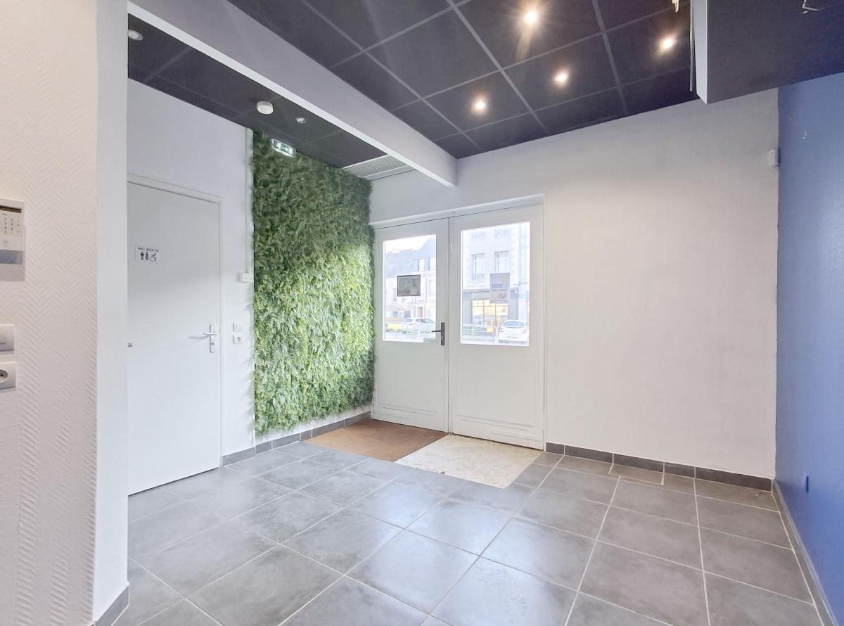 LOCAL COMMERCIAL centre bourg de Goderville, parking à proximité, 35 m² de surface totale, comprenant un espace accueil/bureau, une salle et bloc sanitaires.