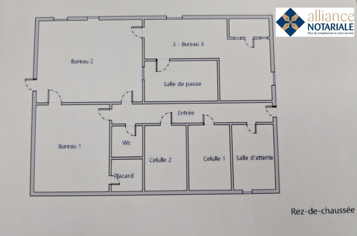 - un couloir desservant une salle d'attente, 3 bureaux dont un avec placard, W.C. indépendant, 3 pièces, 1 cave, 1 garage