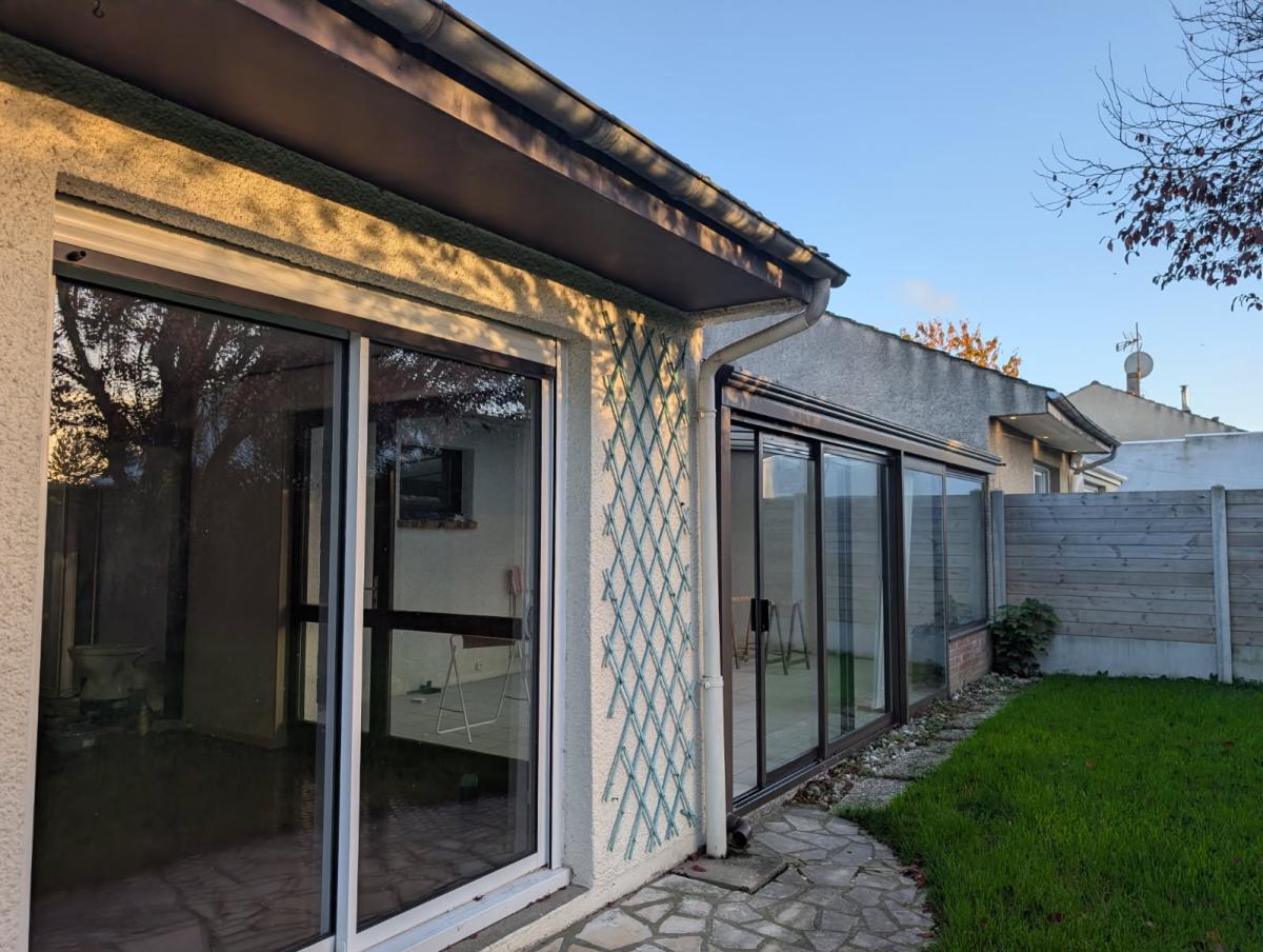 Maison comprenant 3 chambres, une salle de bain avec douche et double vasque, un salon séjour, une cuisine aménagée et équipée (four et plaque de cuisson), une véranda, un grand jardin et un garage.