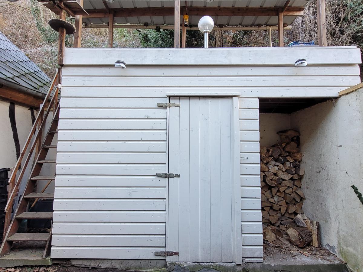 Petite courette sur l'arrière avec petit bâtiment à usage de débarras et bûcher.