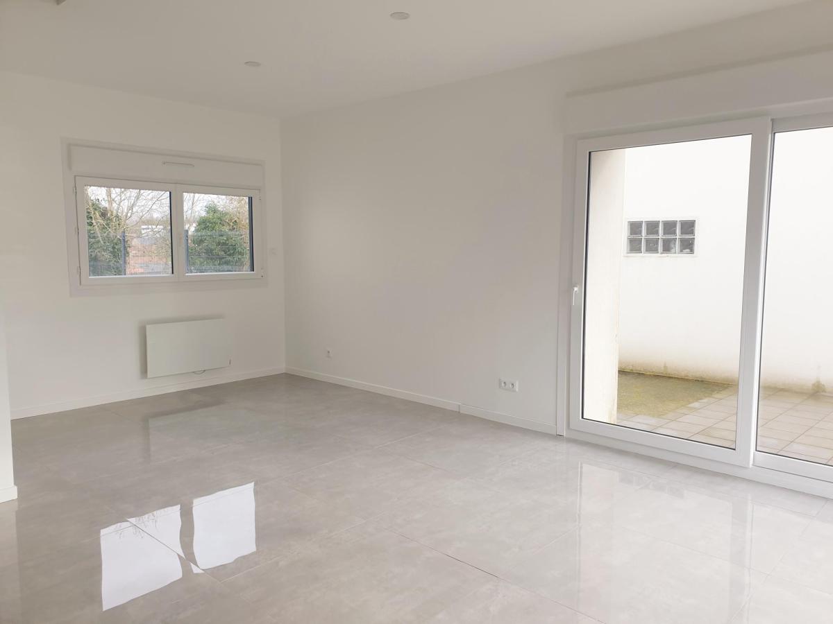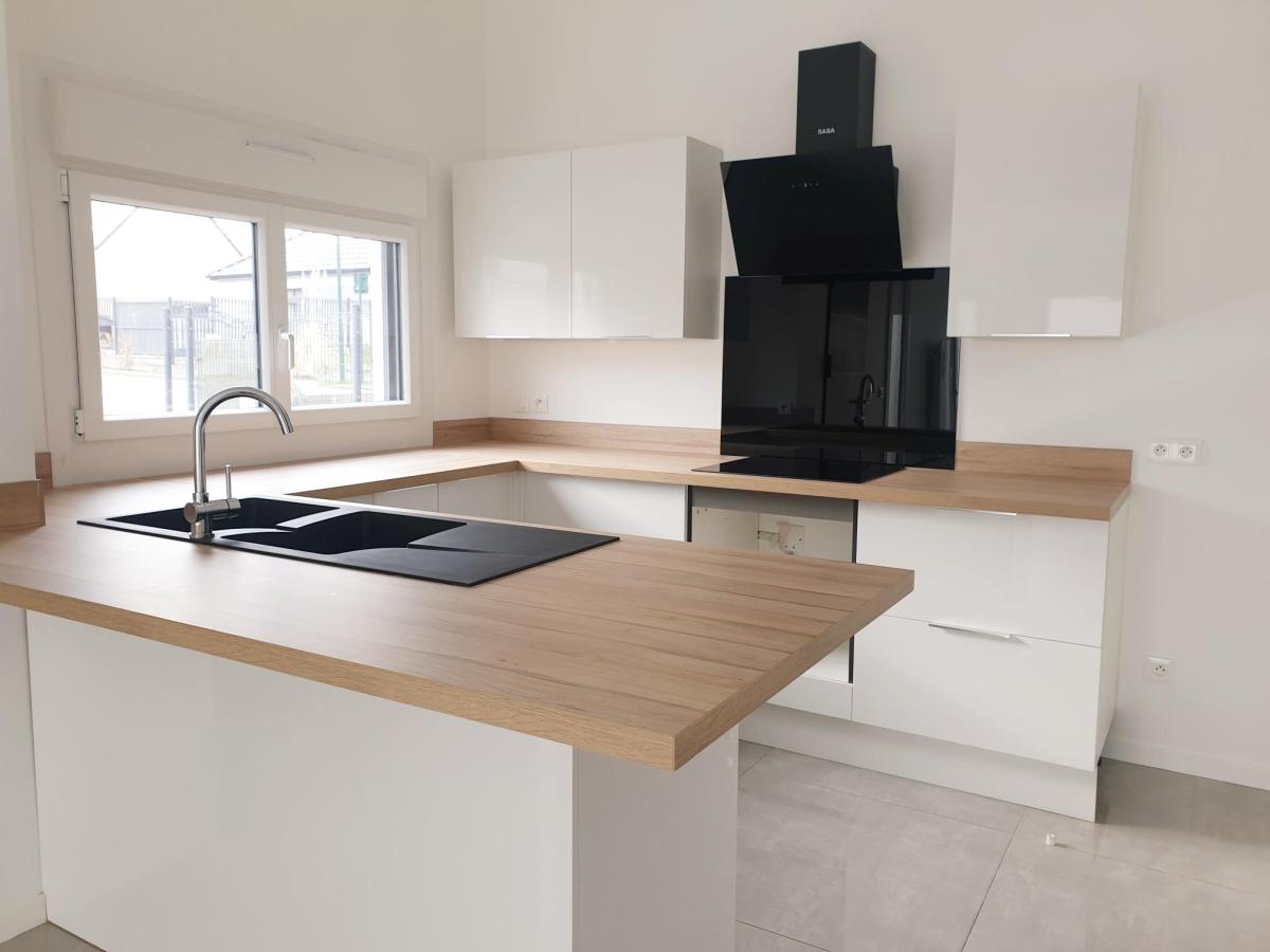 Maison individuelle de plain-pied de 89 m² habitables comprenant un grand séjour avec cuisine ouverte meublée, cellier, 3 chambres, salle de bains, WC.