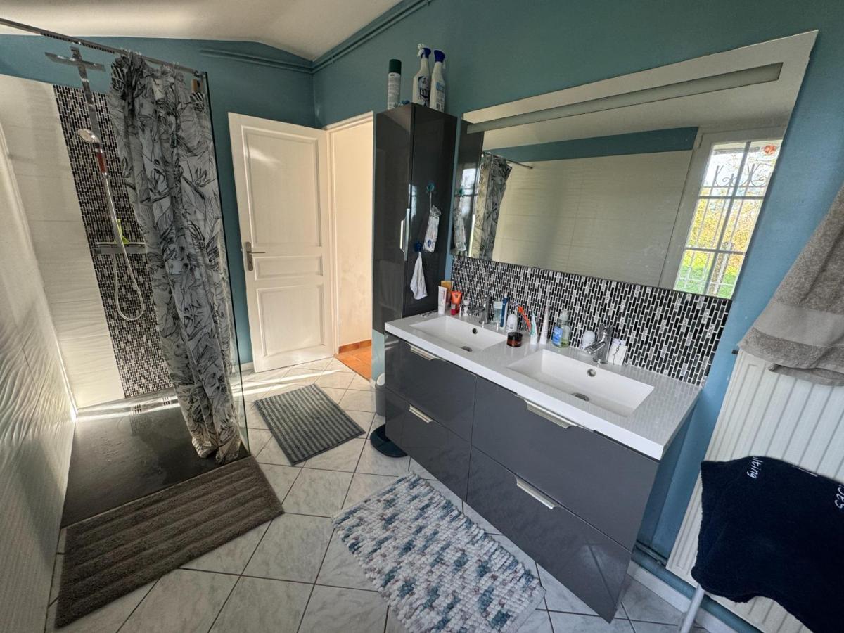 CAMPAGNE BEAUREPAIRE, longère T4 de 91 m² de superficie habitable comprenant : - au rez-de-chaussée : entrée, séjour avec cheminée, cuisine aménagée, une chambre, salle de douche et wc ; - à l'étage : pièce palière (bureau ou salon d'étage), deux chambres. Chaufferie (fuel) avec grenier. Garage. Dépendances avec 2 box et auvent (grand abri pour salon d'extérieur) terrain d'environ 3000 m².