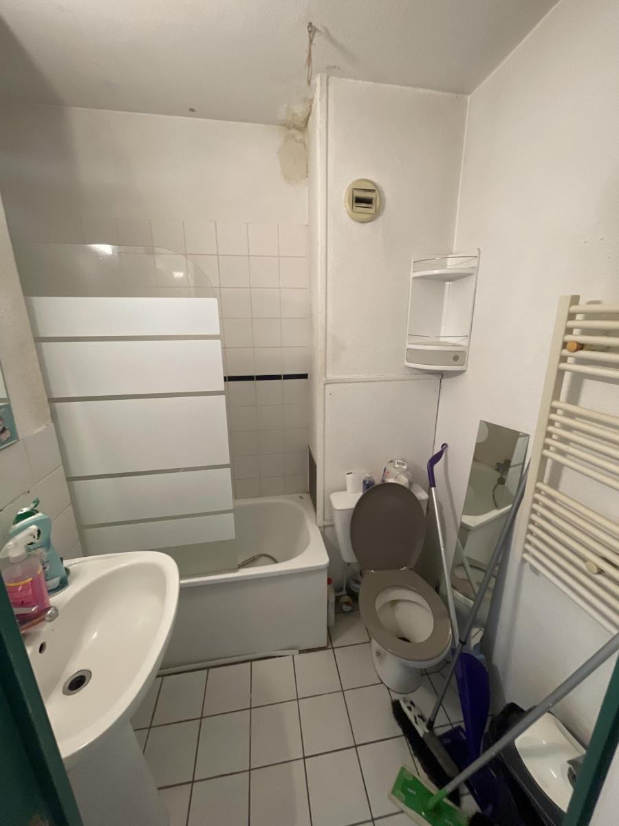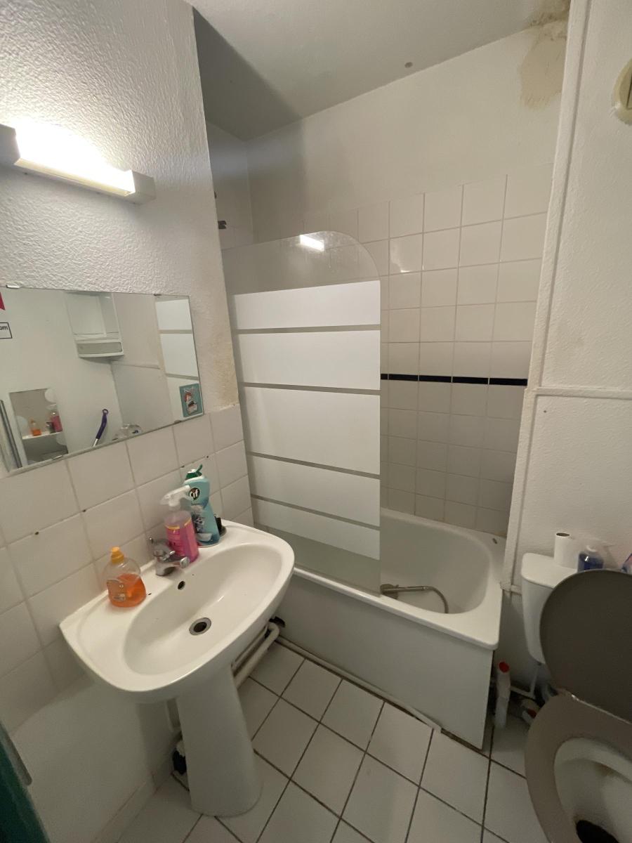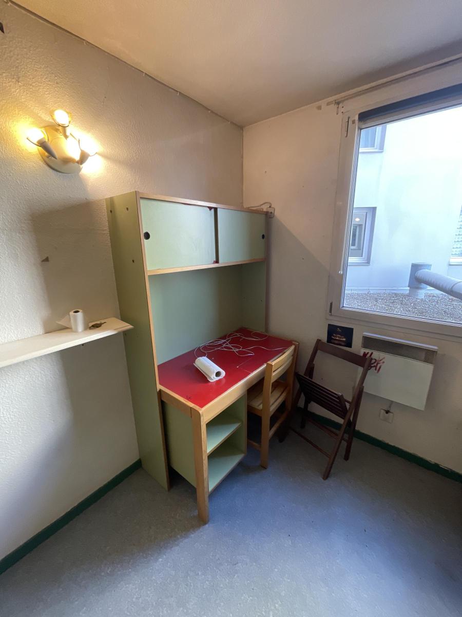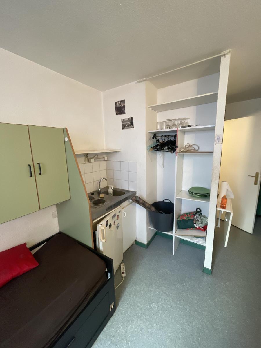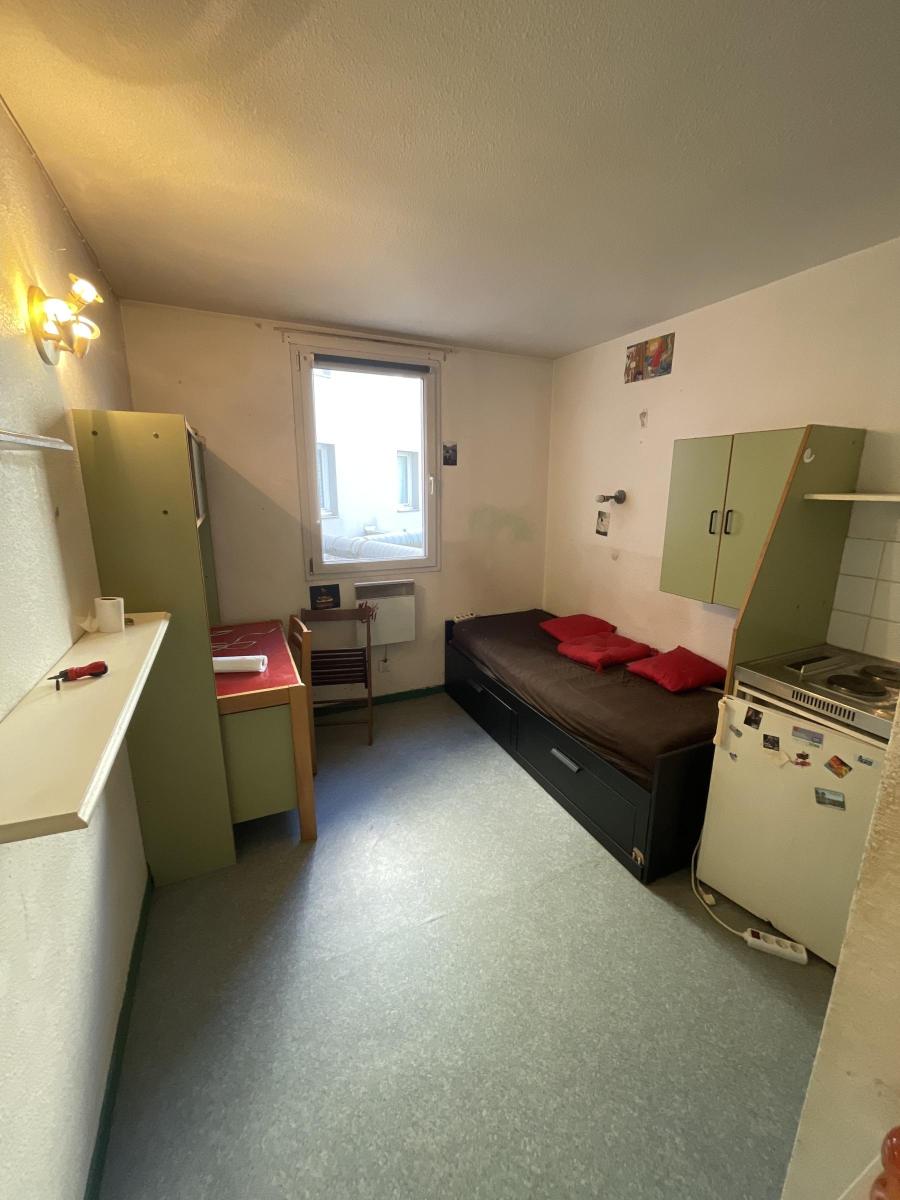 Chambre d'environ 13 m² située dans une Résidence étudiante comprenant une pièce principale avec coin kitchenette (Evier + plaque + frigo) et placard. 1 salle de bains avec baignoire.