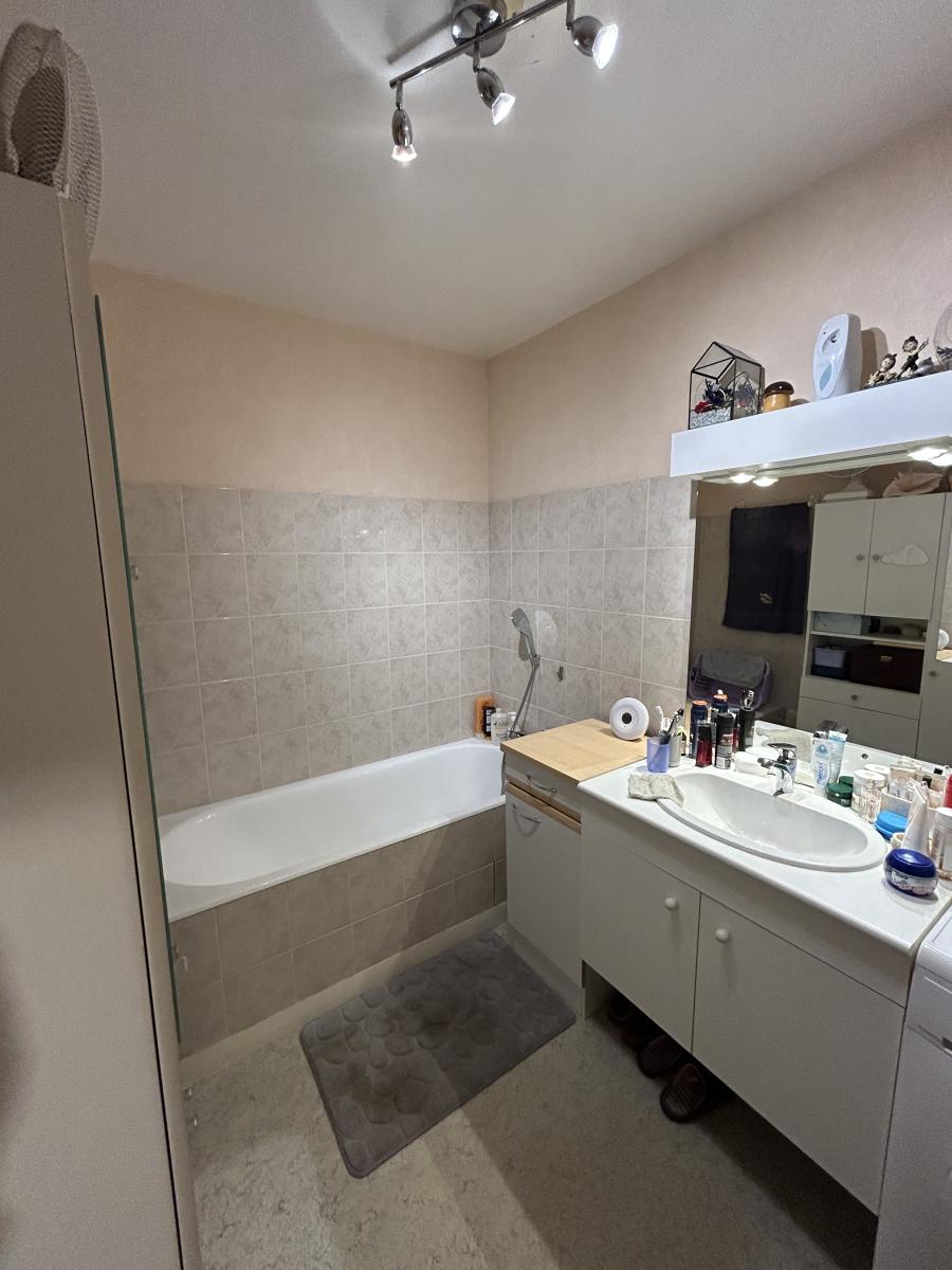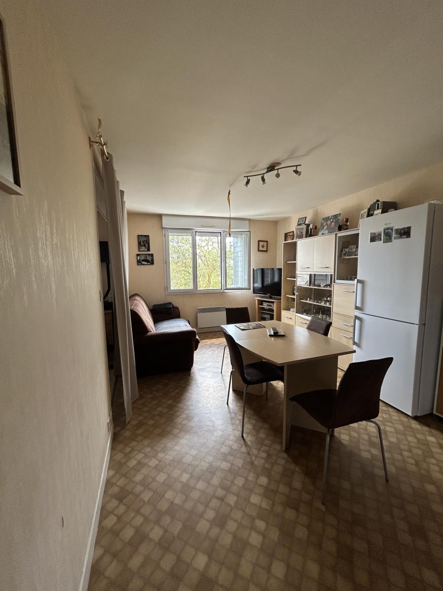 AVRANCHES PROXIMITE IMMEDIATE CENTRE VILLE  COPROPRIETE DE 85 LOTS DONT 30 LOTS D HABITATION CHARGES COPROPRIETE DE 231 EUROS AU TRIMESTRE   T1 Bis , Appartement de 41.60m² comprenant : Pièce de vie avec espace cuisine, ouverte sur une chambre, une salle de bains et un WC. Cave Place de parking. Actuellement loué 364.65 € par mois. Bail en cours se terminant le 10 Novembre 2027. Bien vendu soumis au statut de la copropriété Pas de procédure en cours dans la copropriété Les informations sur les risques auxquels ce bien est exposé sont disponibles sur le site Géorisques : www. georisques. gouv. fr