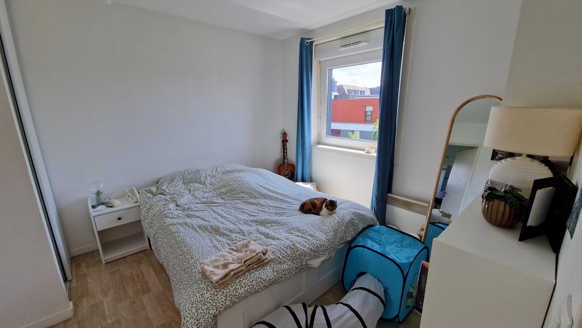 A VENDRE A ROUBAIX, A MOINS DE 5 MINUTES A PIED DU TRAMWAY ALFRED MONGY - DANS UNE RESIDENCE DE 2008, Un appartement situé au 4eme étage avec ascenseur, comprenant une entrée avec placard, belle pièce de vie , parquet, baie vitrée sur terrasse, cuisine ouverte aménagée, 1 grande chambre avec placard, une salle de bains attenante avec baignoire, wc séparés,