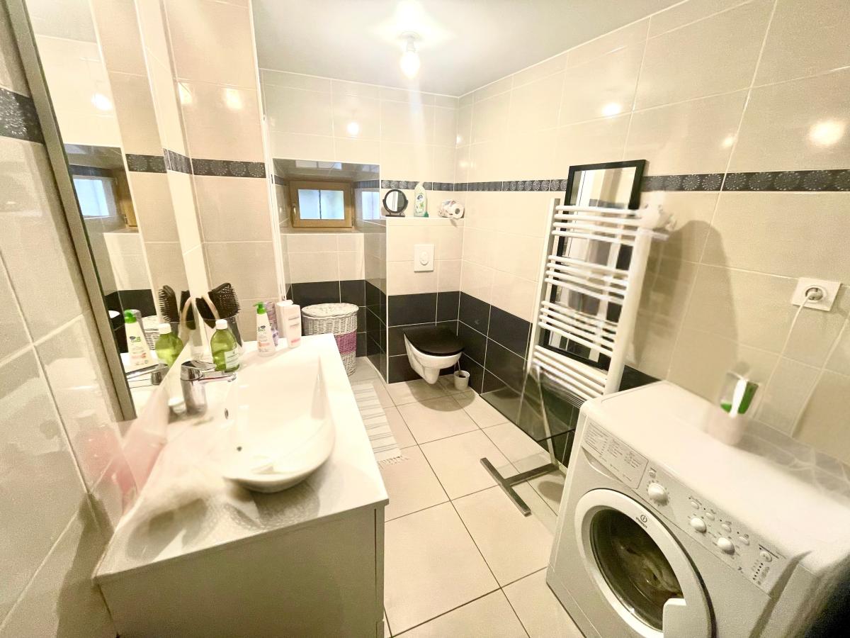 Salle de bains entièrement faïencée, douche à l'italienne, meuble sous vasque, 2 grands caissons w.c. suspendu, cumulus 200 L.