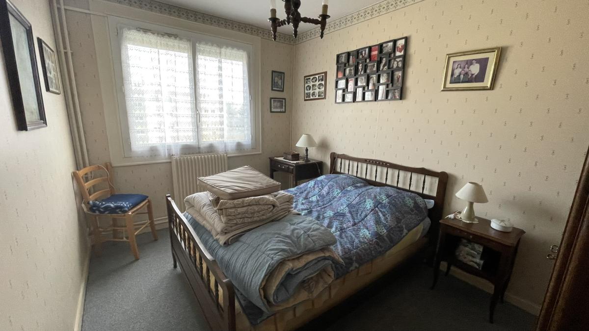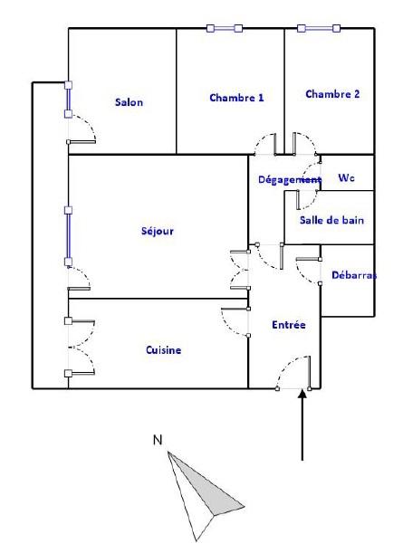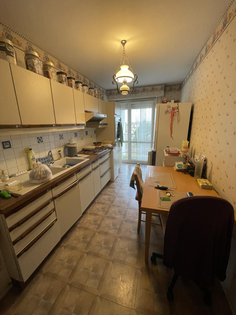 Un appartement situé au cinquième et dernier étage d'un immeuble en copropriété des années 70, avec ascenseur, comprenant une entrée, un débarras, une cuisine, un séjour, un salon avec balcon filant, un dégagement desservant deux chambres, une salle de bains, et des wc séparés.