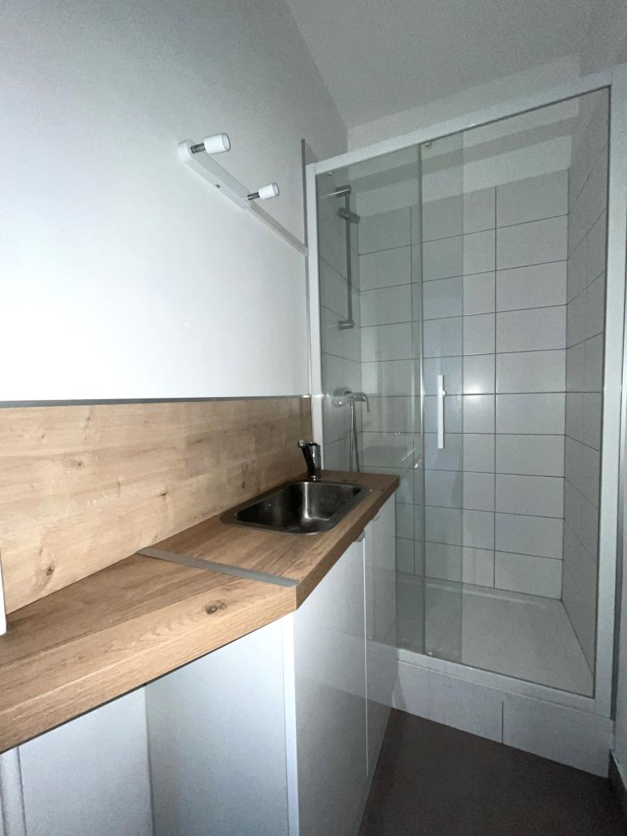- Pièce principale, dégagement, salle de douches avec meuble vasque.