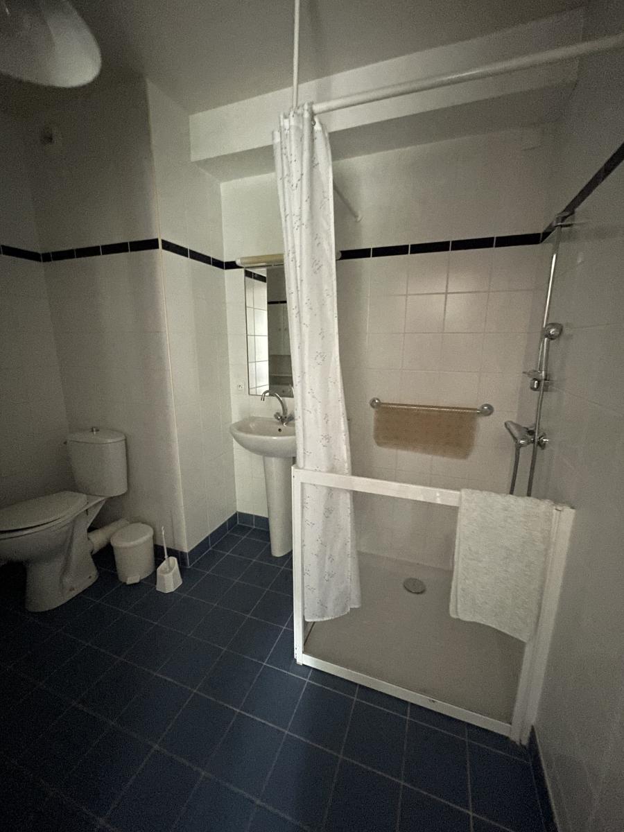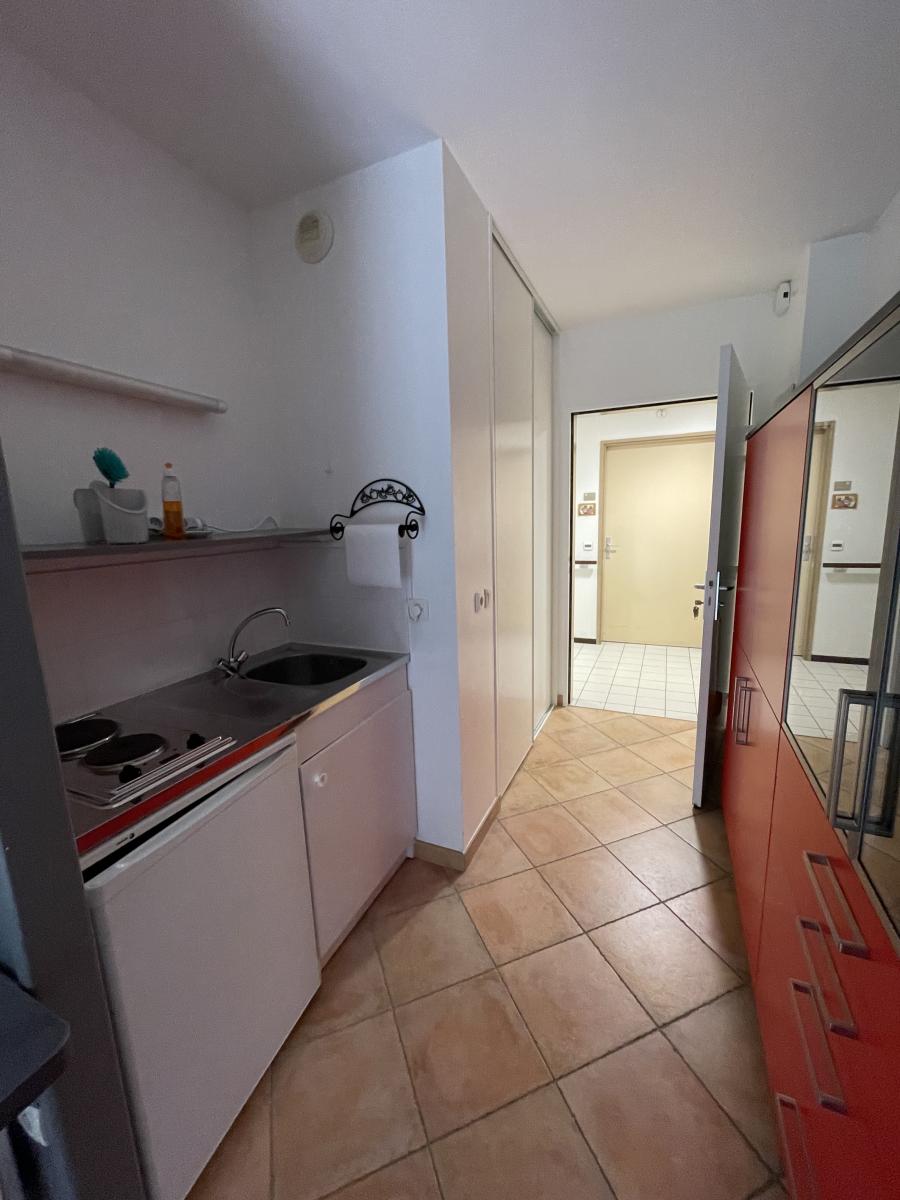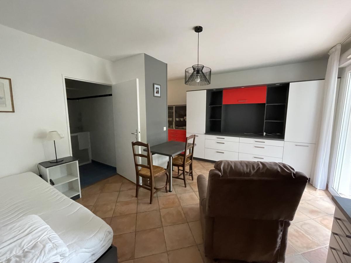 entrée avec placard, kitchenette avec plaques électriques, four et rangements, pièce de vie (coin chambre/coin repas avec table et grands placards), salle d'eau avec WC. Balcon donnant sur la verdure. Chauffage électrique (radiateurs récents).