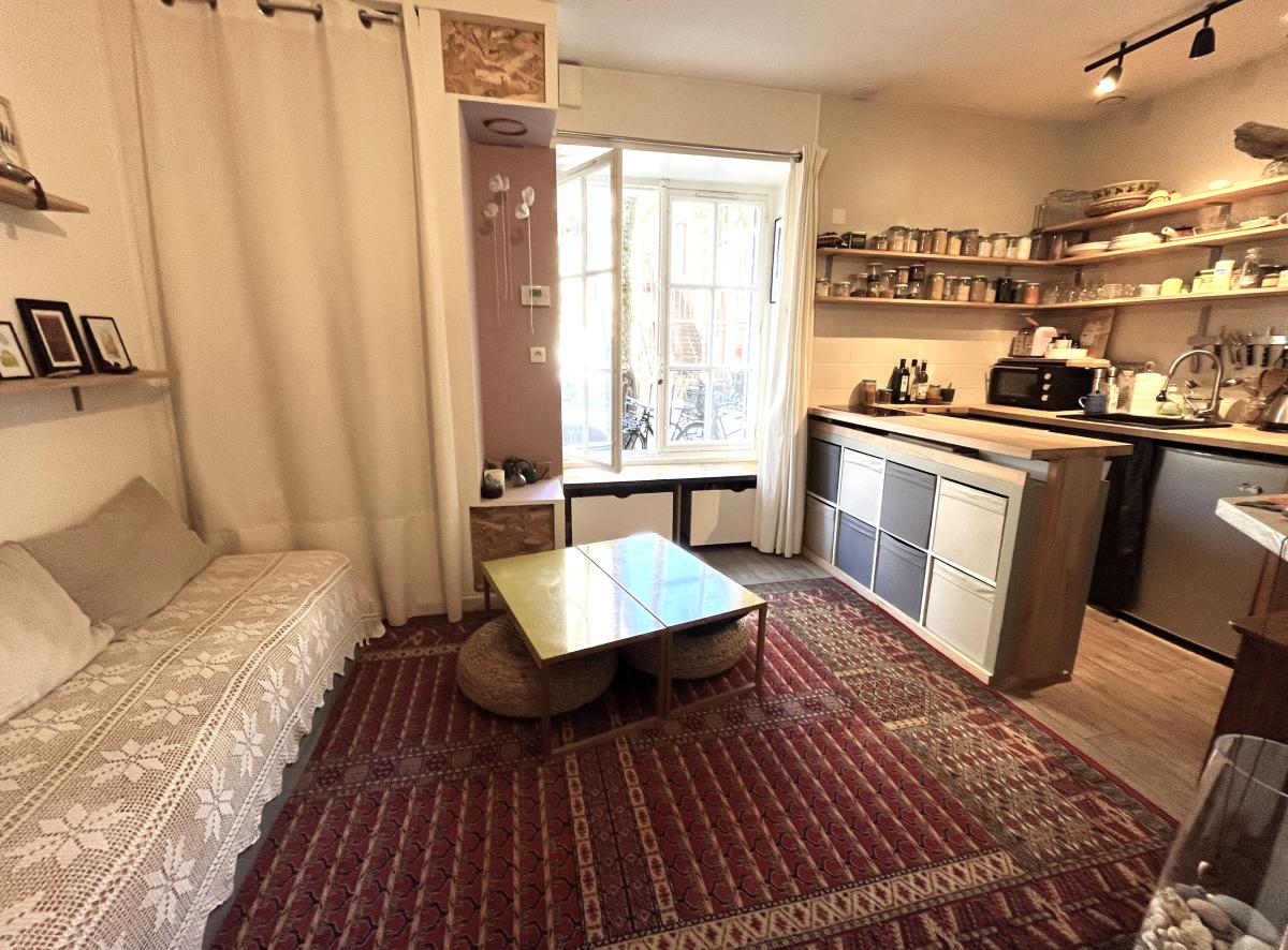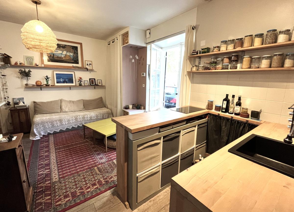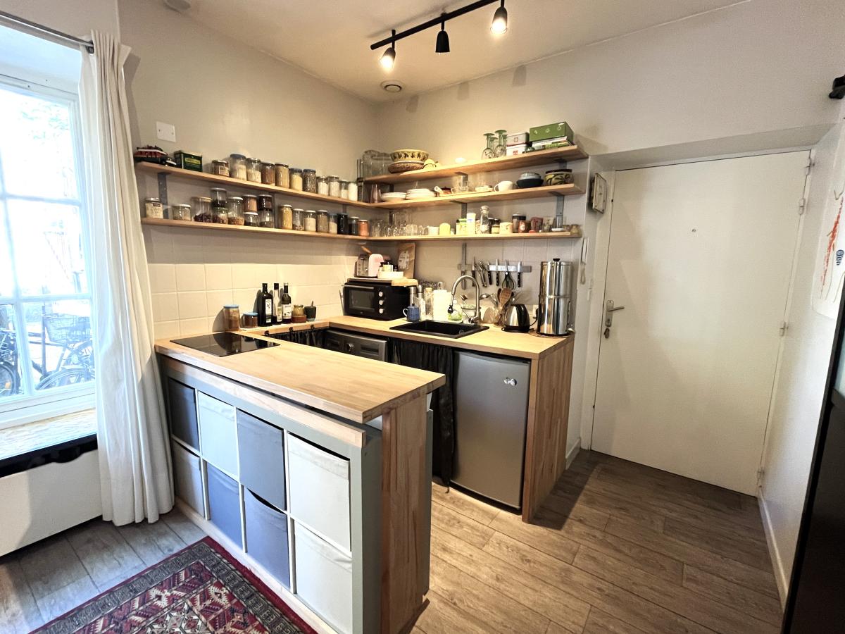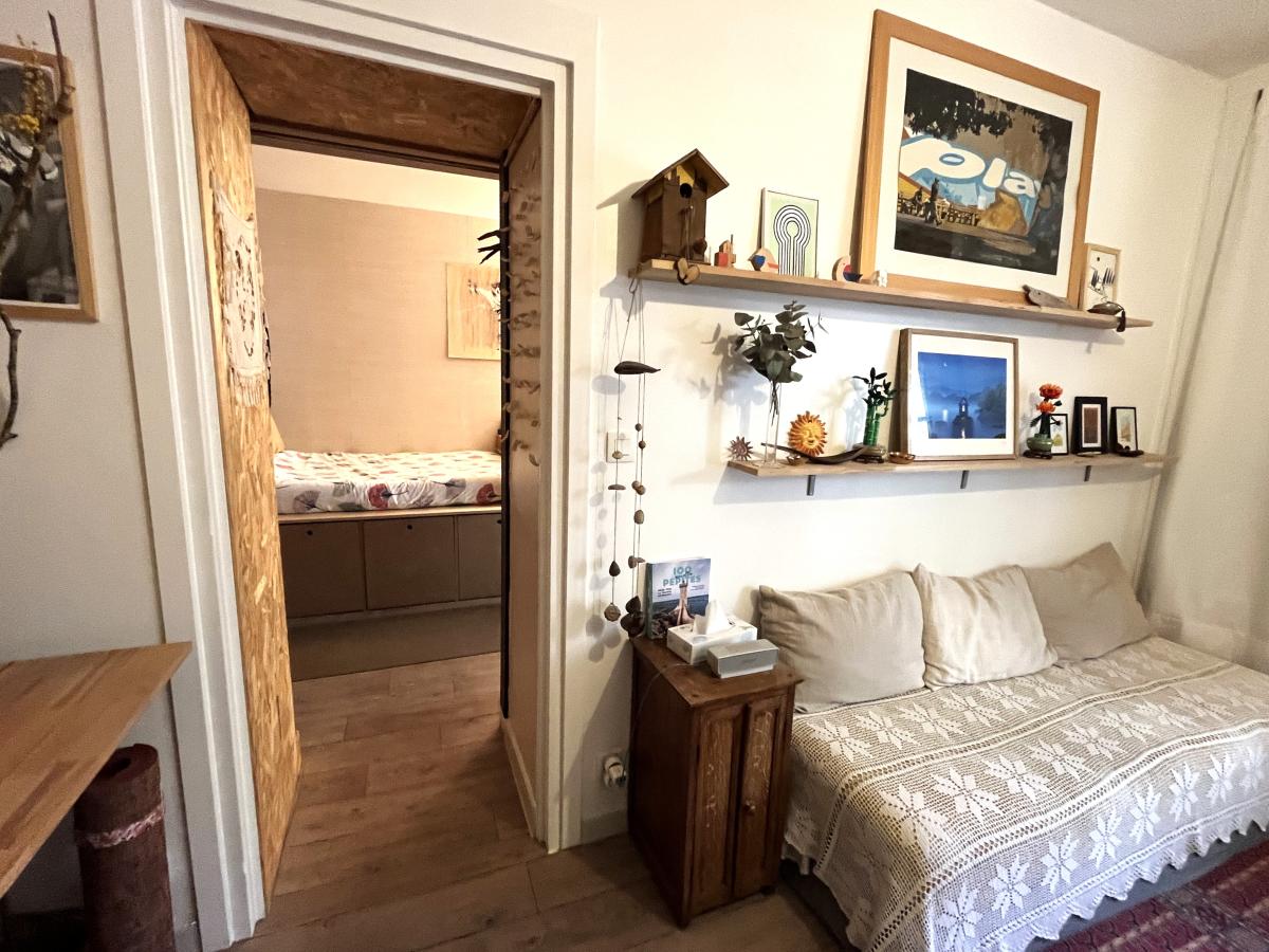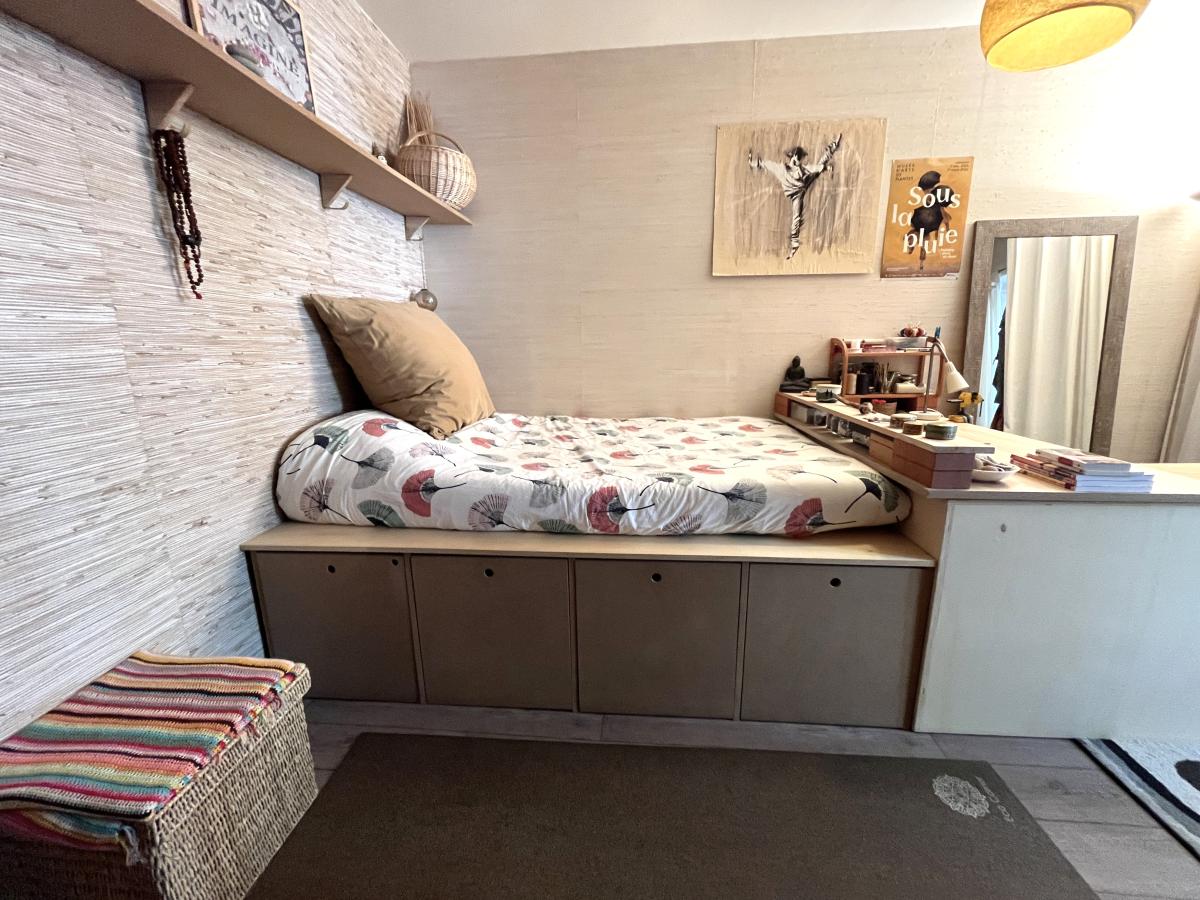 Séjour-cuisine 17 m², chambre 14 m² avec meuble bibliothèque, salle de bains-wc 4 m².