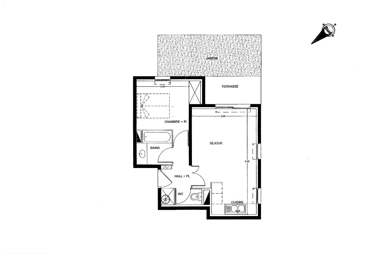 comprenant une entrée avec placard, un séjour avec coin cuisine donnant l'accès à une terrasse couverte et un jardin d'une superficie totale d'environ 19m², une chambre avec placard, une salle de bains et un WC indépendant.