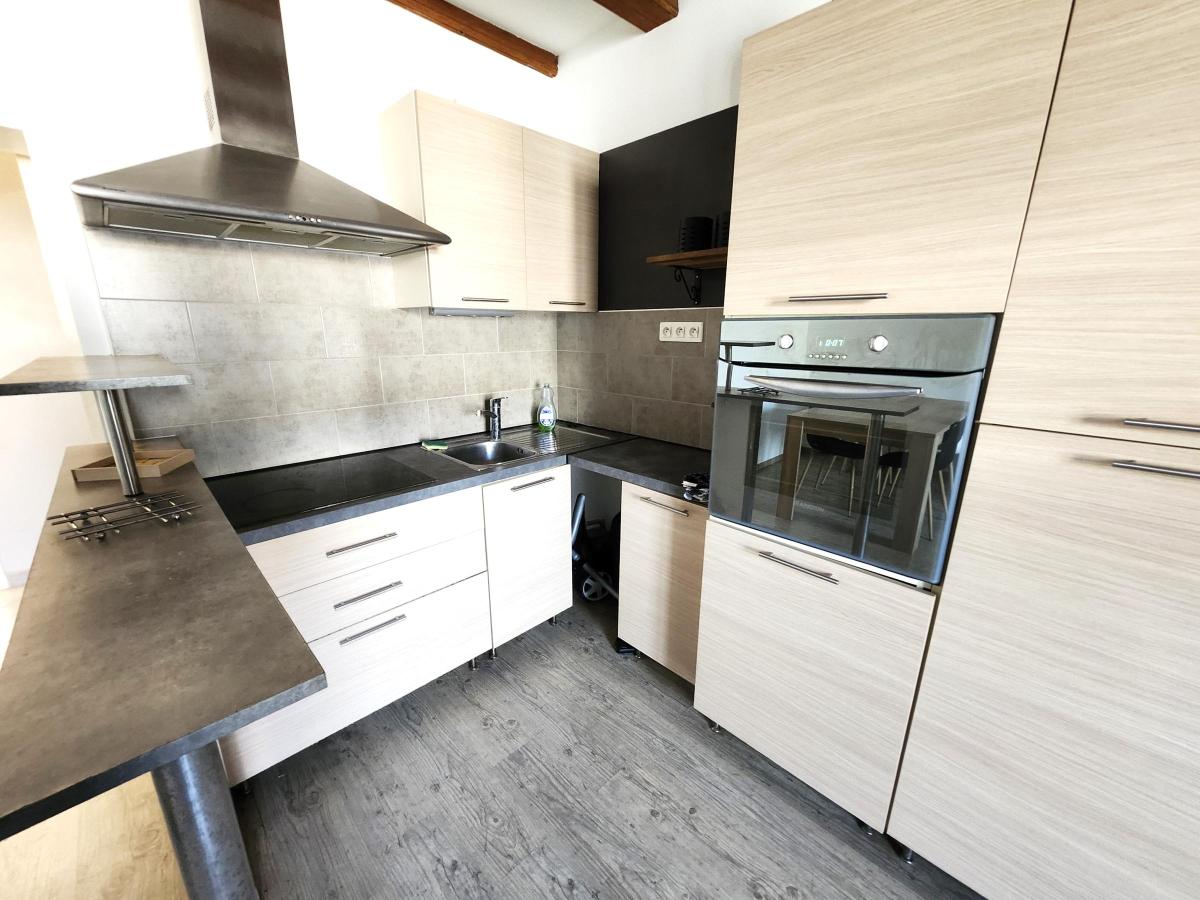 Une entrée desservant une pièce de vie avec cuisine ouverte aménagée et équipée, une chambre avec rangements, une salle d'eau avec WC suspendu.