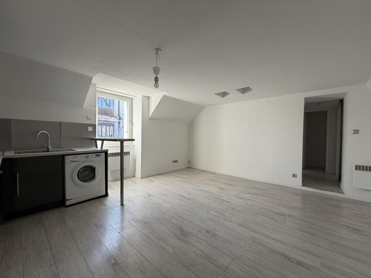 Un séjour avec cuisine ouverte équipée (réfrigérateur, plaques vitrocéramiques, hotte, machine à laver), un dégagement, une chambre, une salle d’eau et des WC.