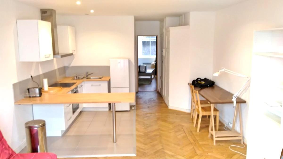 Appartement T2 vendu loué en meublé (bail d'un an) offrant un sas d'entrée, cuisine équipée ouverte avec bar, séjour lumineux avec parquet chevron et bow-windows, salle de douche avec emplacement machine à laver, chambre côté cour avec rangements.
