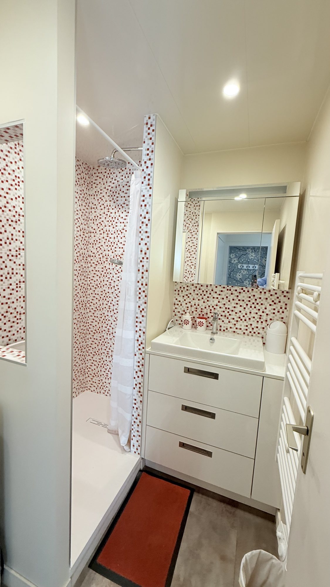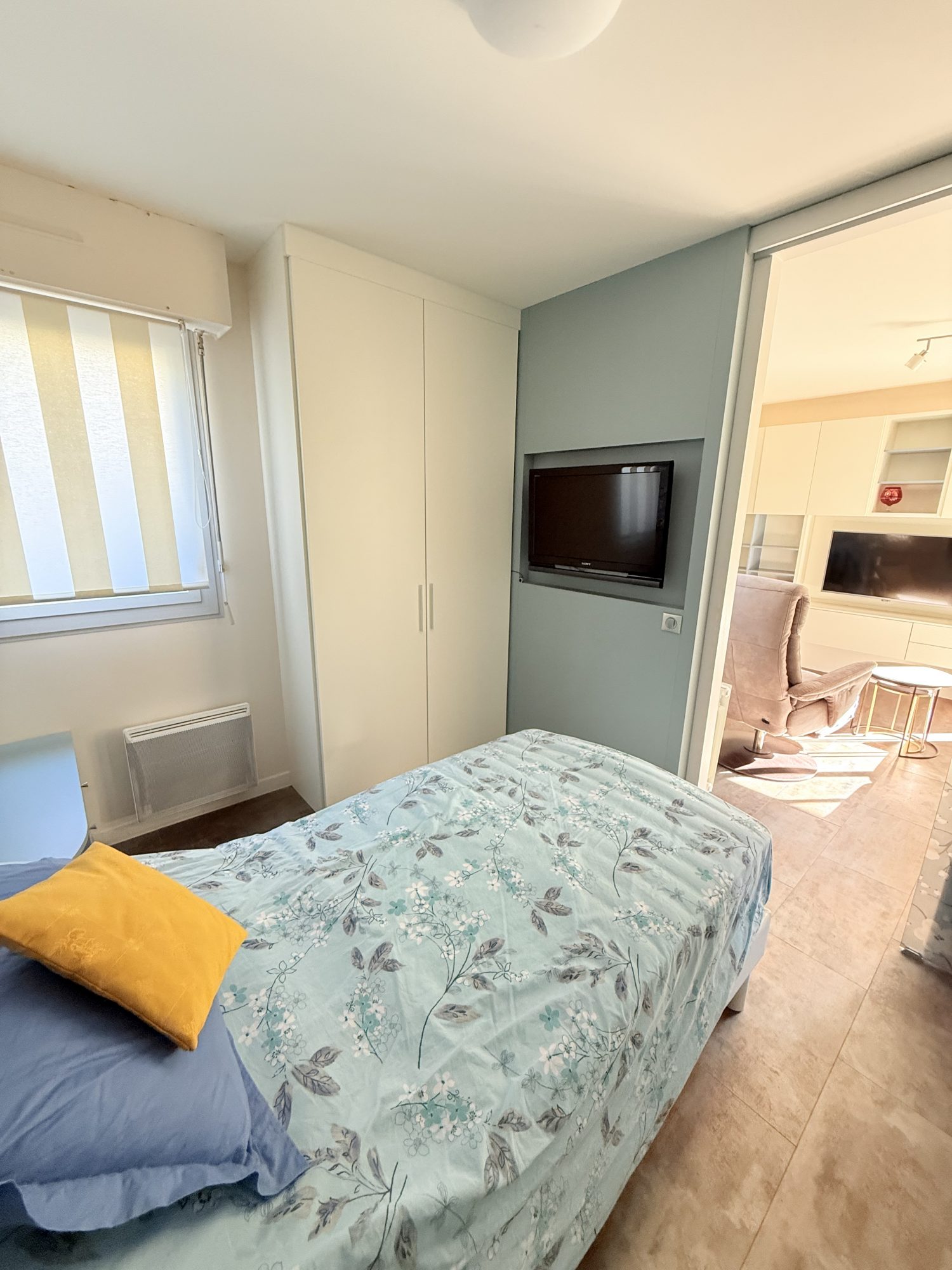 - L’appartement est vendu avec le lit et de nombreux placards intégrés dans le salon, la salle à manger, la cuisine et la chambre, offrant des rangements optimisés.