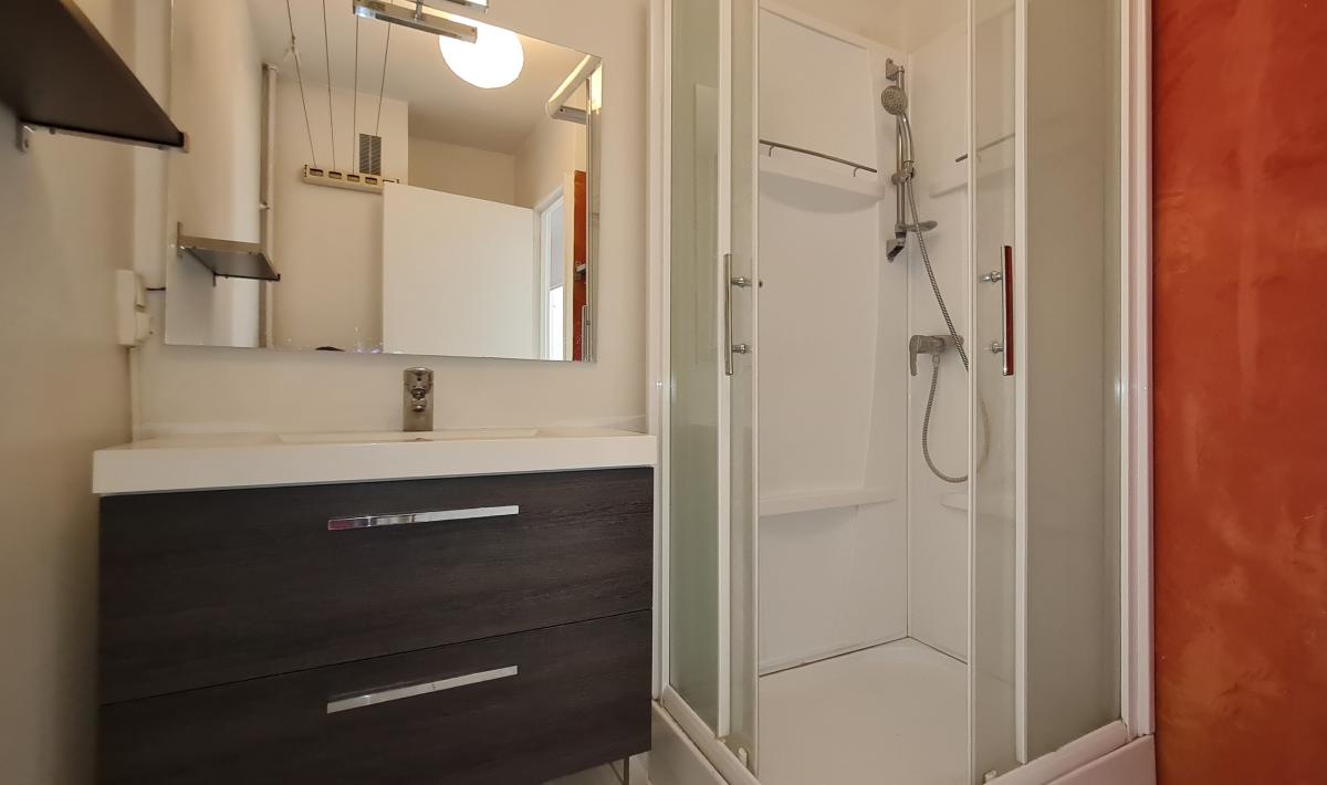 Bel appartement de type 2, comprenant entrée avec placard, wc, cuisine aménagée et équipée, cellier, pièce de vie lumineuse, une chambre avec placard, salle de bains.