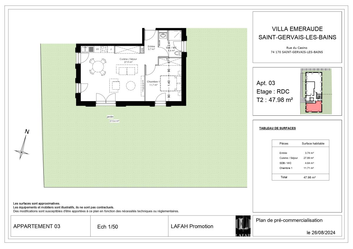 L'office notarial vous propose à la vente cet appartement 2 pièces d'une superficie habitable de 47,98 m² situé au rez-de-jardin du programme immobilier neuf "VILLA EMERAUDE" en cours d'édification au cœur du village du Fayet.