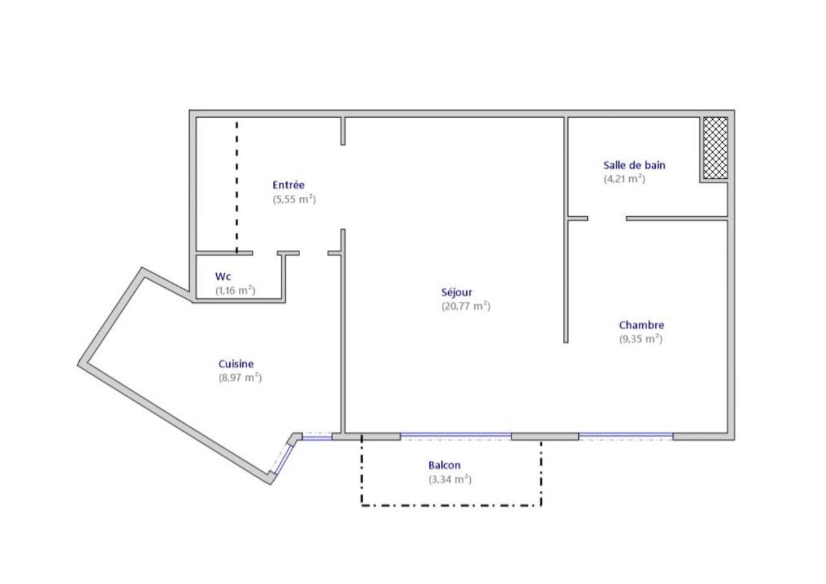 Ce bien à rénover, d'une surface de 50m2 carrez dispose d'un plan très rationnel: une entrée avec placards, un grand séjour de 20m2 ouvrant sur un balcon, une cuisine attenante (pouvant etre ouverte sur le séjour et une chambre avec sa salle de bains mitoyenne.