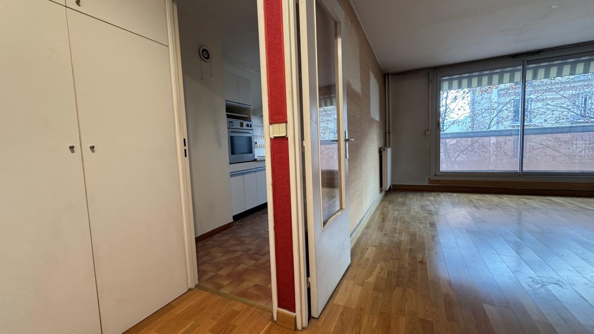 Notaire vend, au 4ème étage d'une copropriété de 1976, de bon standing et avec gardienne, ce deux pièces à rénover composé ainsi : une entrée avec placards , une cuisine (possibilité d'ouverture) le séjour double et un coin chambre (avec possibilité de recréer facilement un séjour et une chambre) accessible également par un couloir avec placards où se trouvent la salle de bains et les WC
