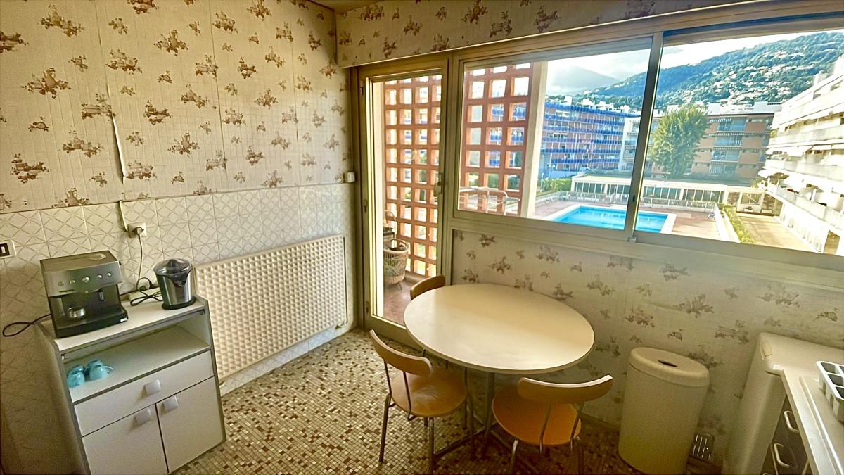 une cuisine indépendante donnant sur une loggia vue piscine, une salle d'eau et un wc