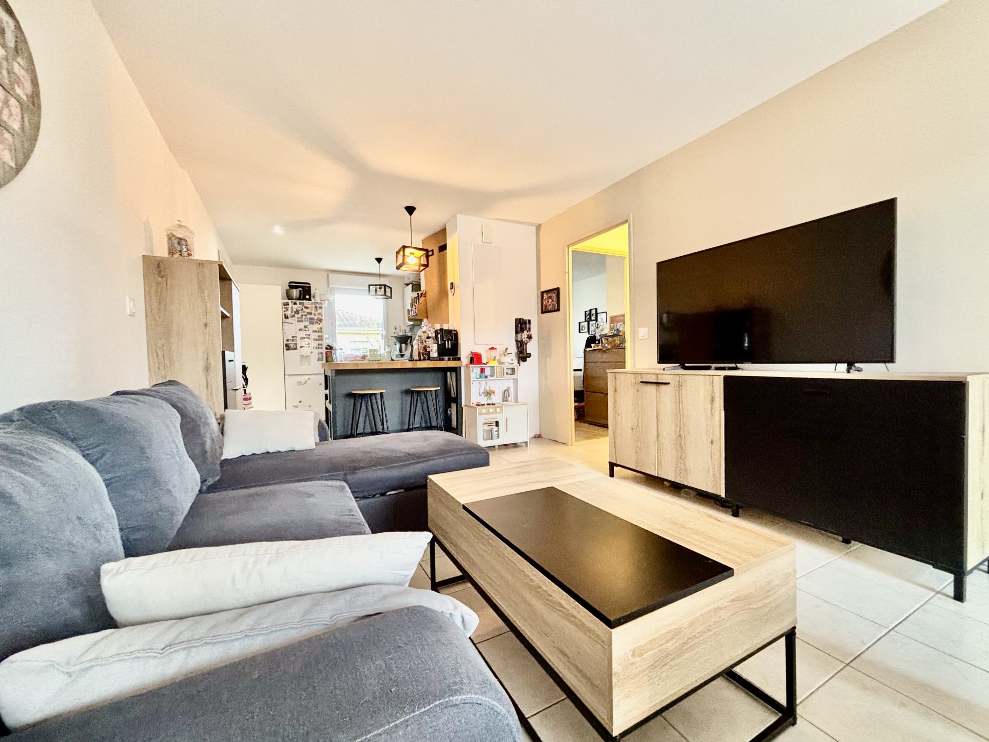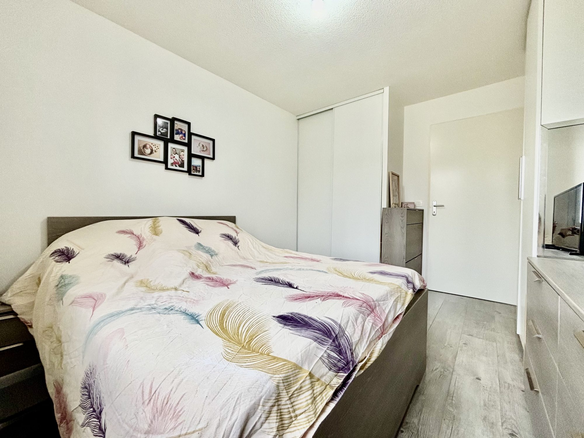 Une entrée donnant sur une cuisine aménagée et équipée (four, plaque, hotte), un séjour lumineux avec un accès au balcon, un bureau pouvant servir de chambre et un dégagement desservant une chambre avec rangement, une salle de bains et un wc indépendant.