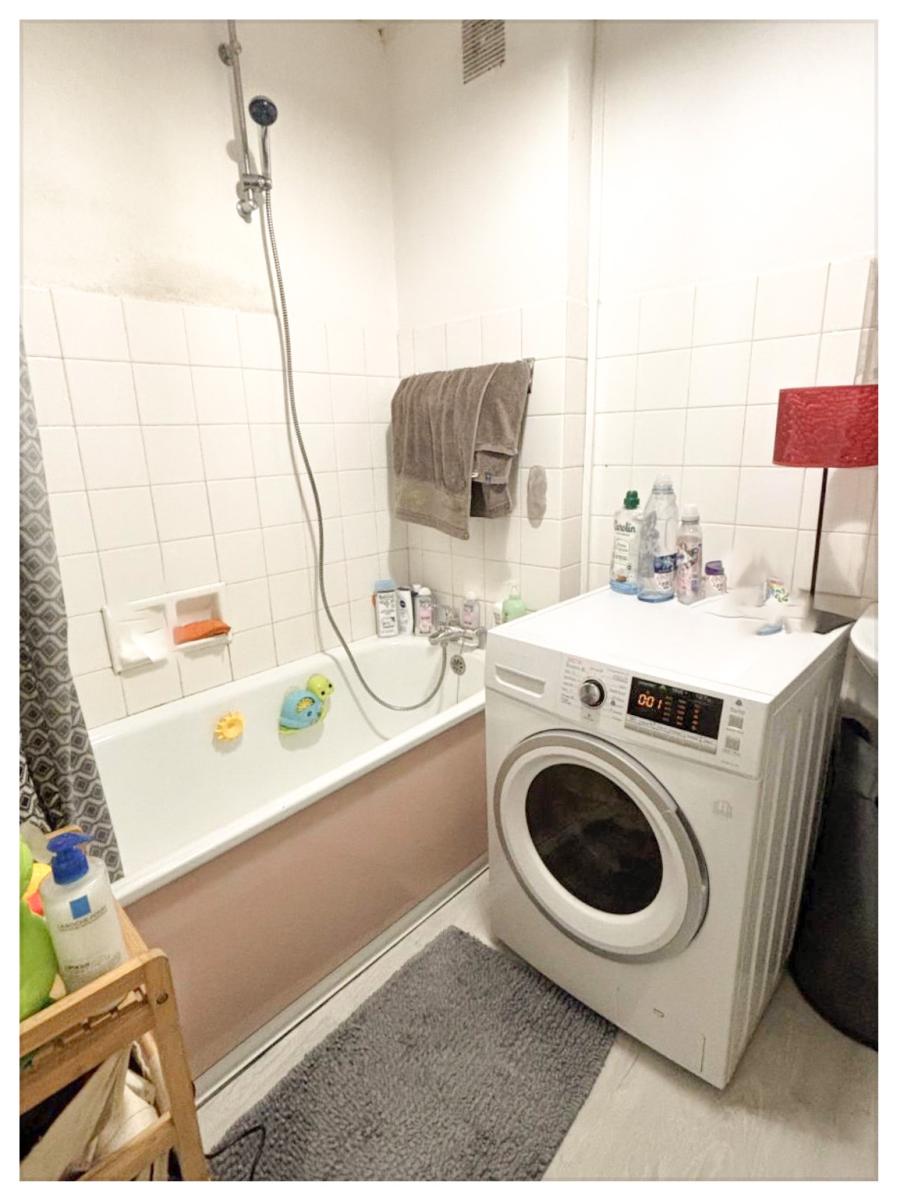 Une salle de bains avec baignoire, douche, et espace pour machine à laver