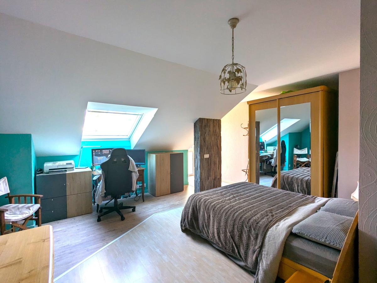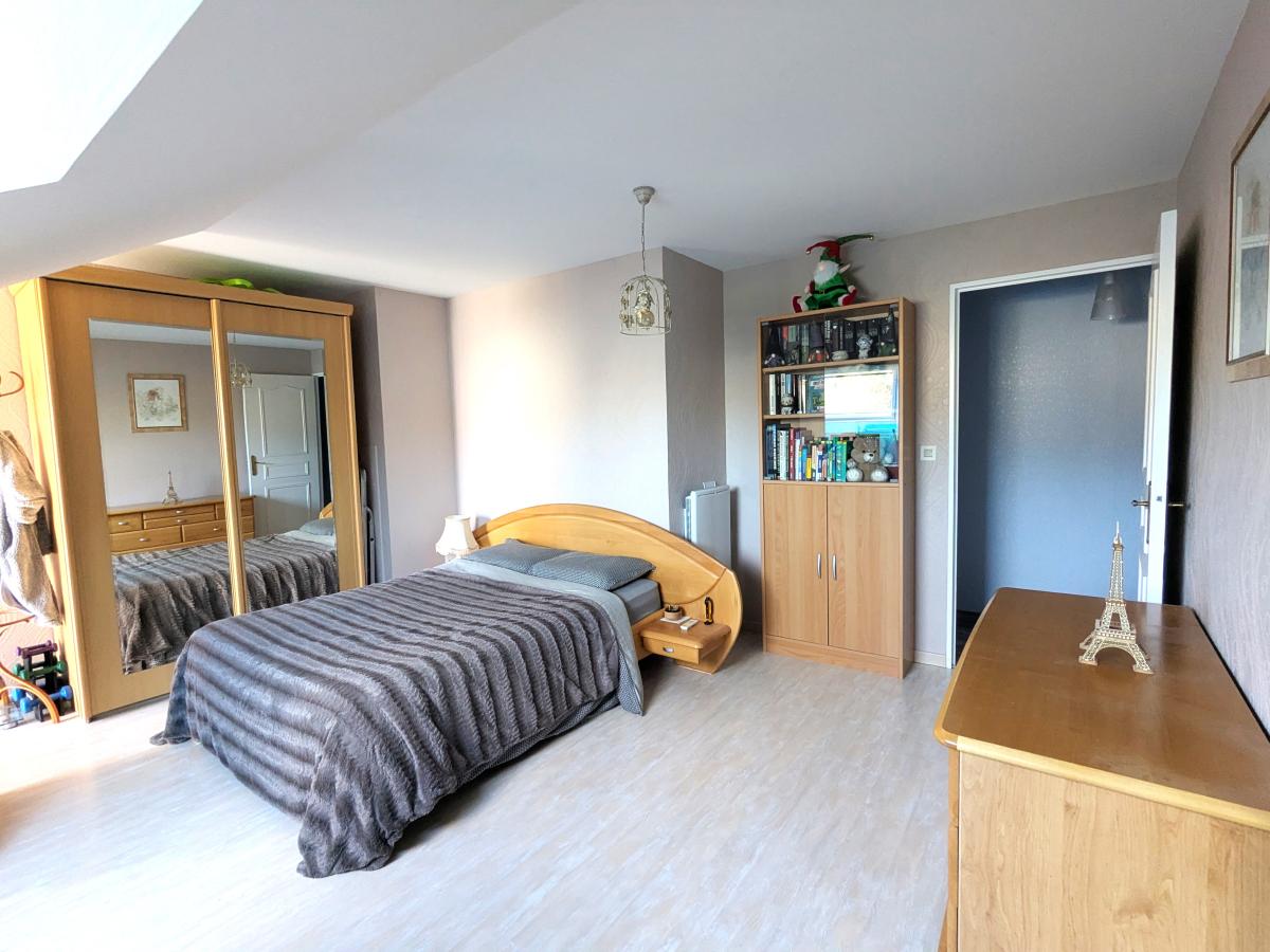 A l'étage : Un palier dessert une vaste chambre d'environ 22,76 m² au sol ( soit 17,83 m² carrez) et sa salle de bains attenante.