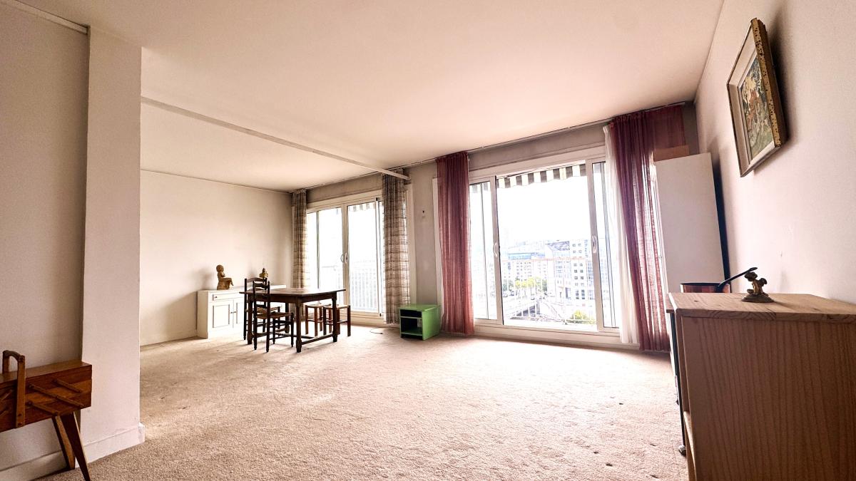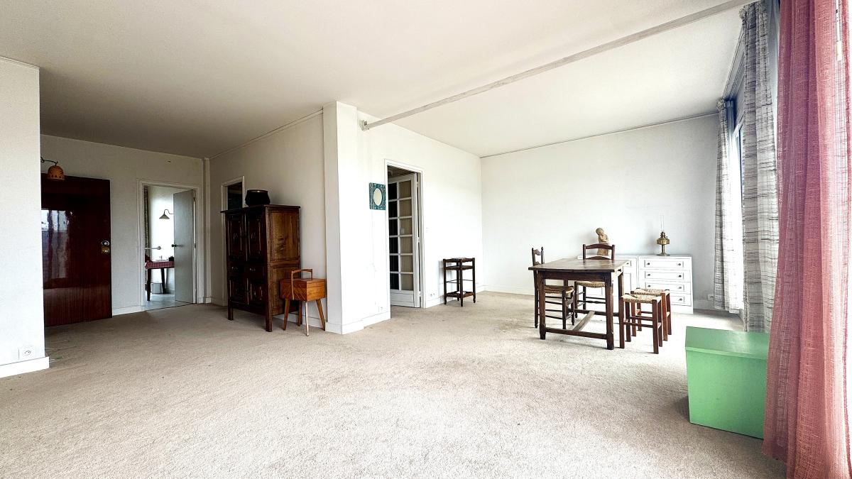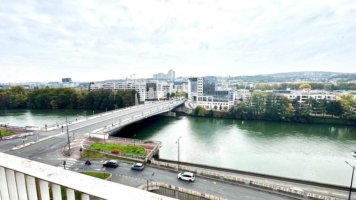 Notaire vend, au 9ème étage d'un immeuble en copropriété de 1960, cet appartement composé : d'un double séjour avec balcon offrant une vue dégagée sur la Seine et les collines de Meudon et Saint-Cloud, une chambre et la cuisine également sans vis à vis, une salle de douche, un wc indépendant et une cave
