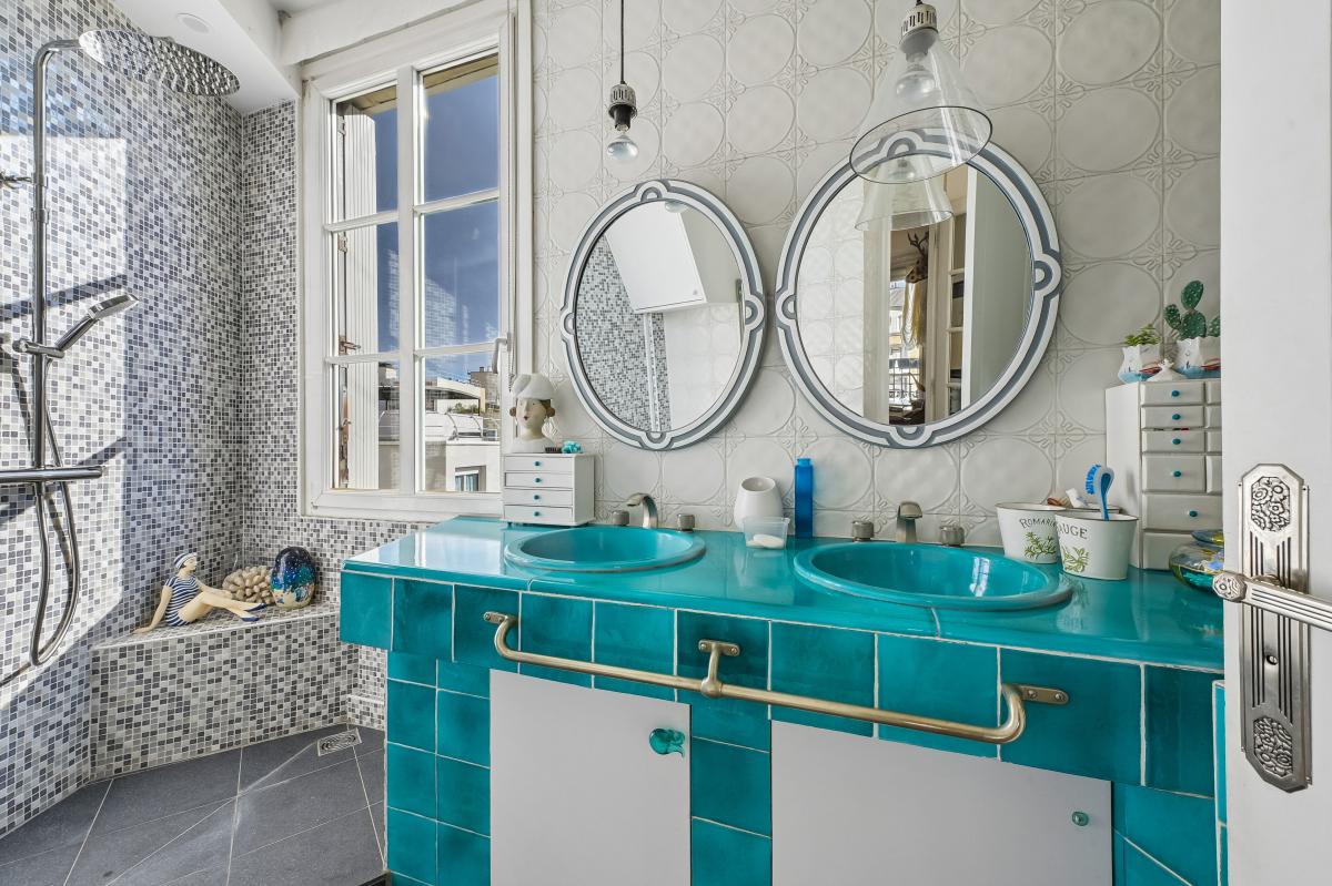 La cuisine séparée, entièrement équipée, dispose également de son propre balcon côté cour, idéal pour profiter d’un environnement plus calme.