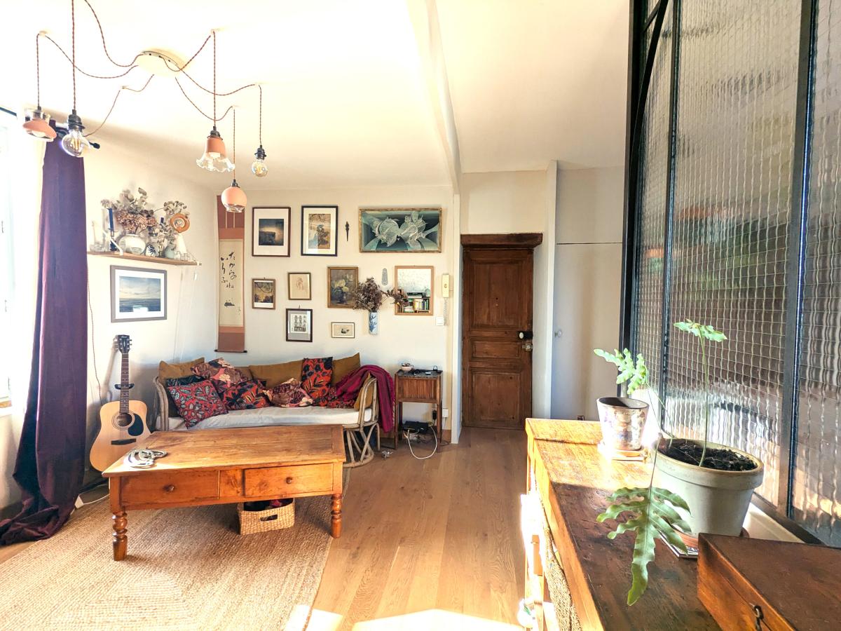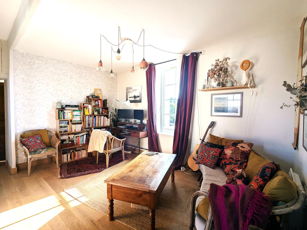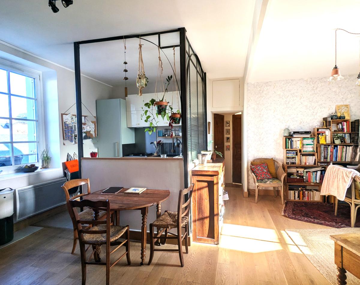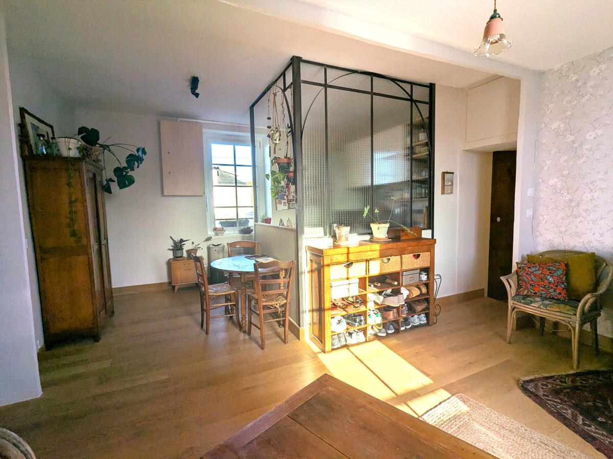 Dès l’entrée, vous découvrez une belle pièce de vie salon-séjour d’environ 21 m², lumineuse et conviviale. La cuisine équipée et aménagée, ouverte sur le séjour et mise en valeur par une ancienne verrière, apporte beaucoup de cachet à l’ensemble.