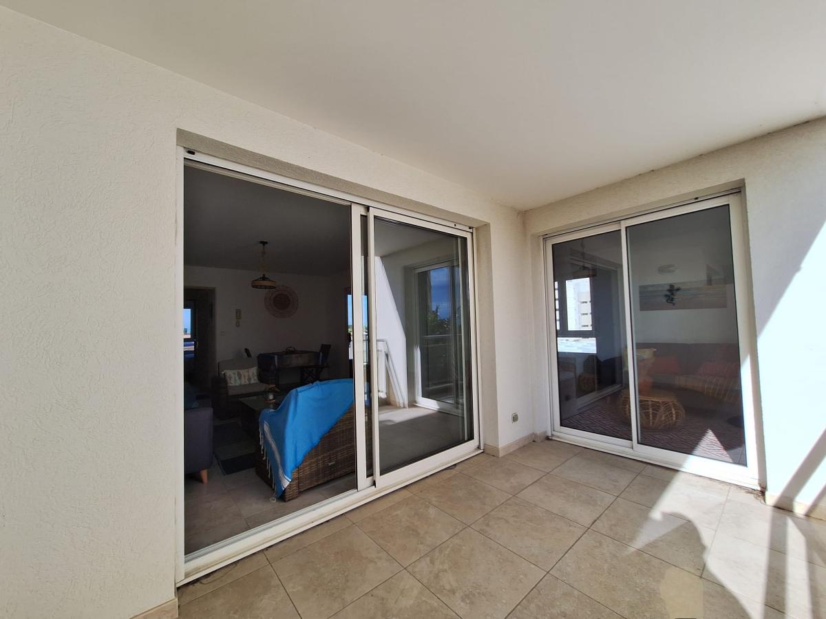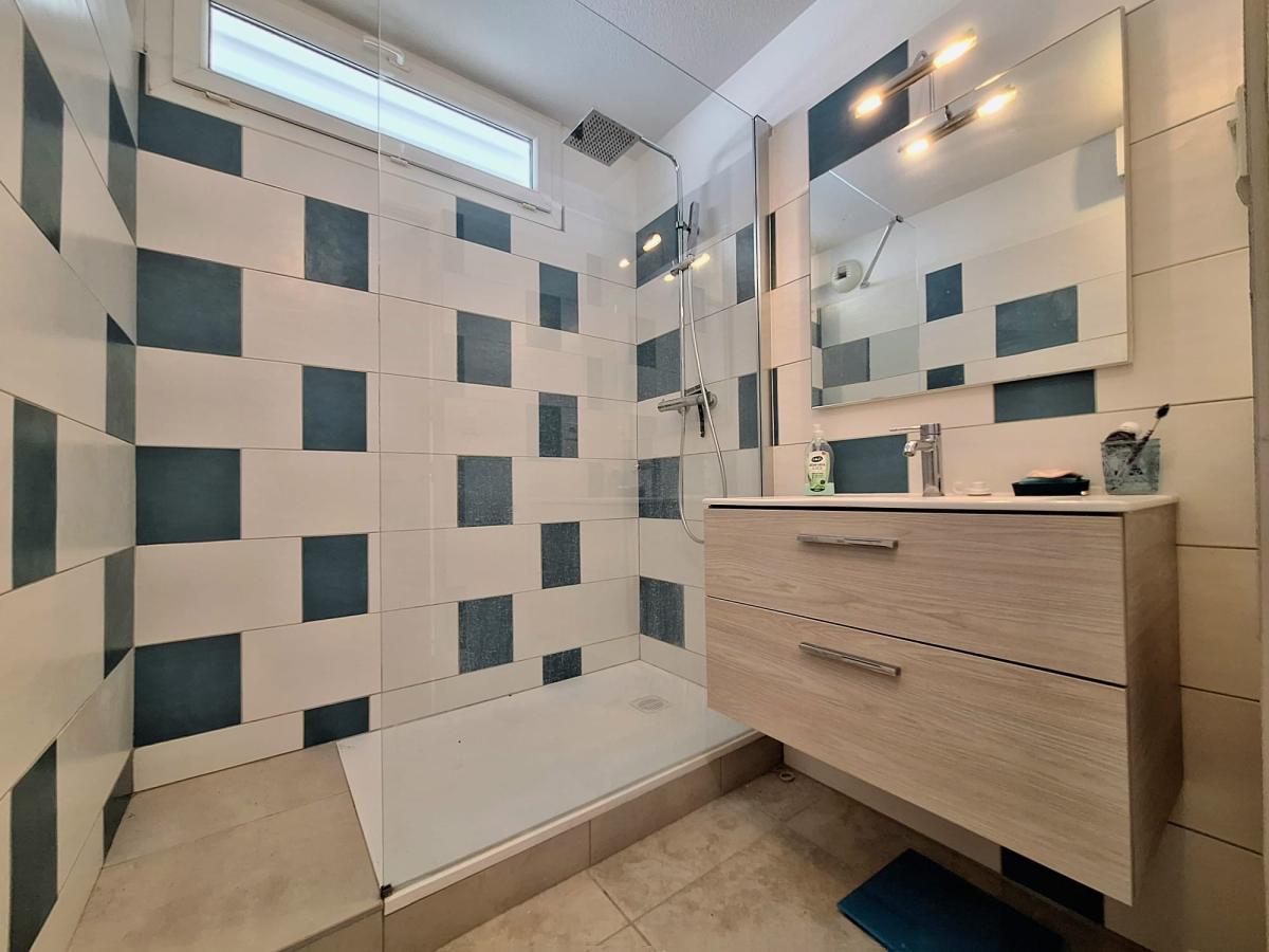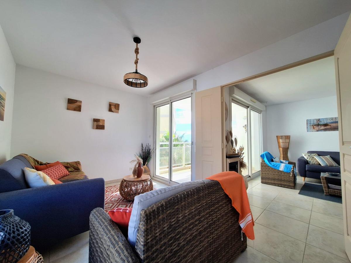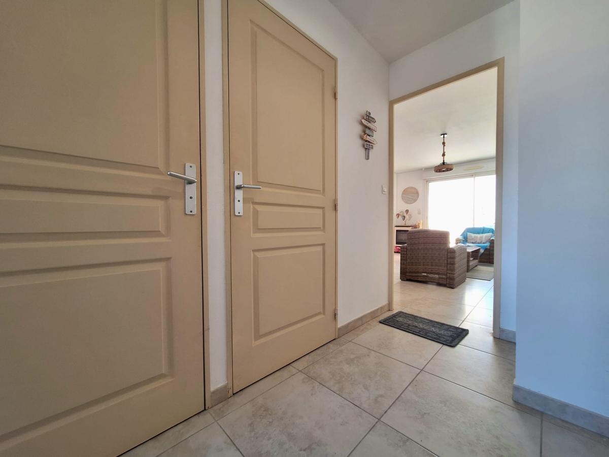 L’entrée avec placards dessert un séjour lumineux de 20 m² ouvert sur la terrasse avec une agréable vue mer.