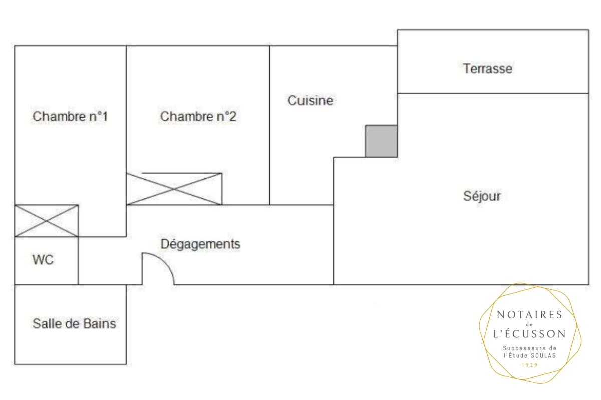 Composé d'une entrée avec un grand placard, un séjour ouvert sur la terrasse, une cuisine avec également un accès sur la terrasse, deux chambres dont une avec placard, une salle de bains et wc séparés.