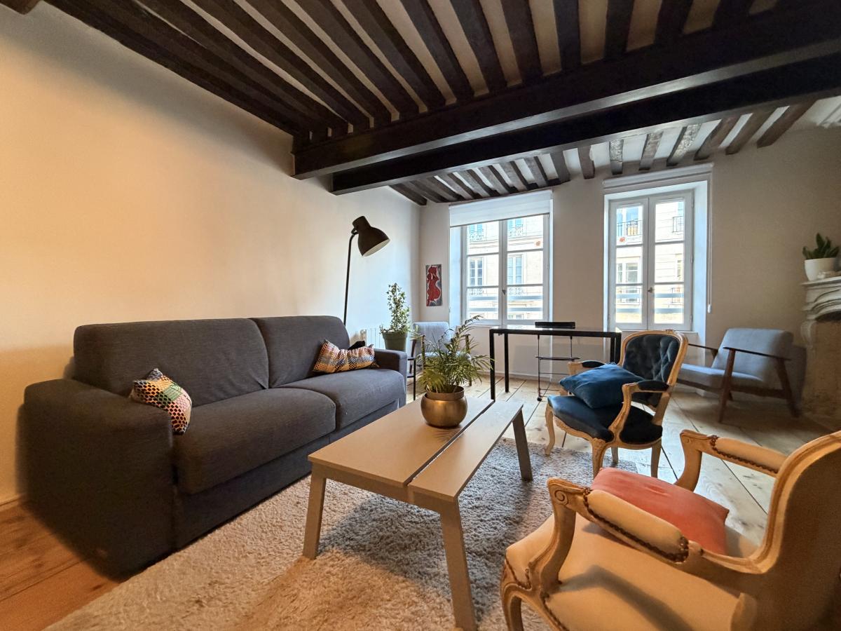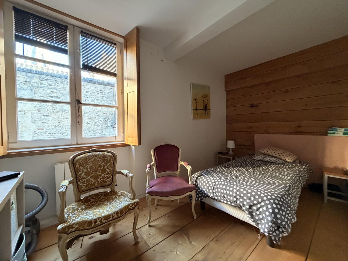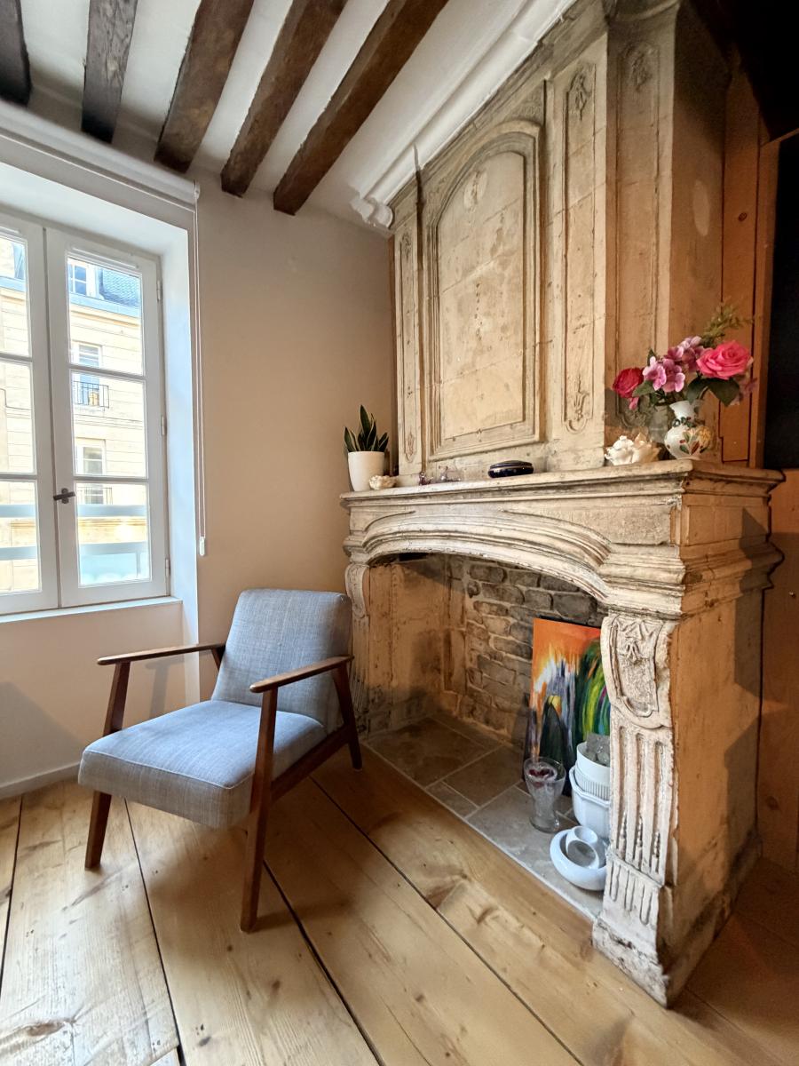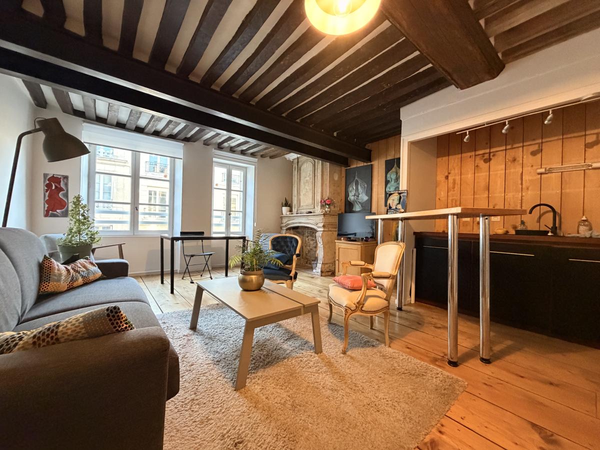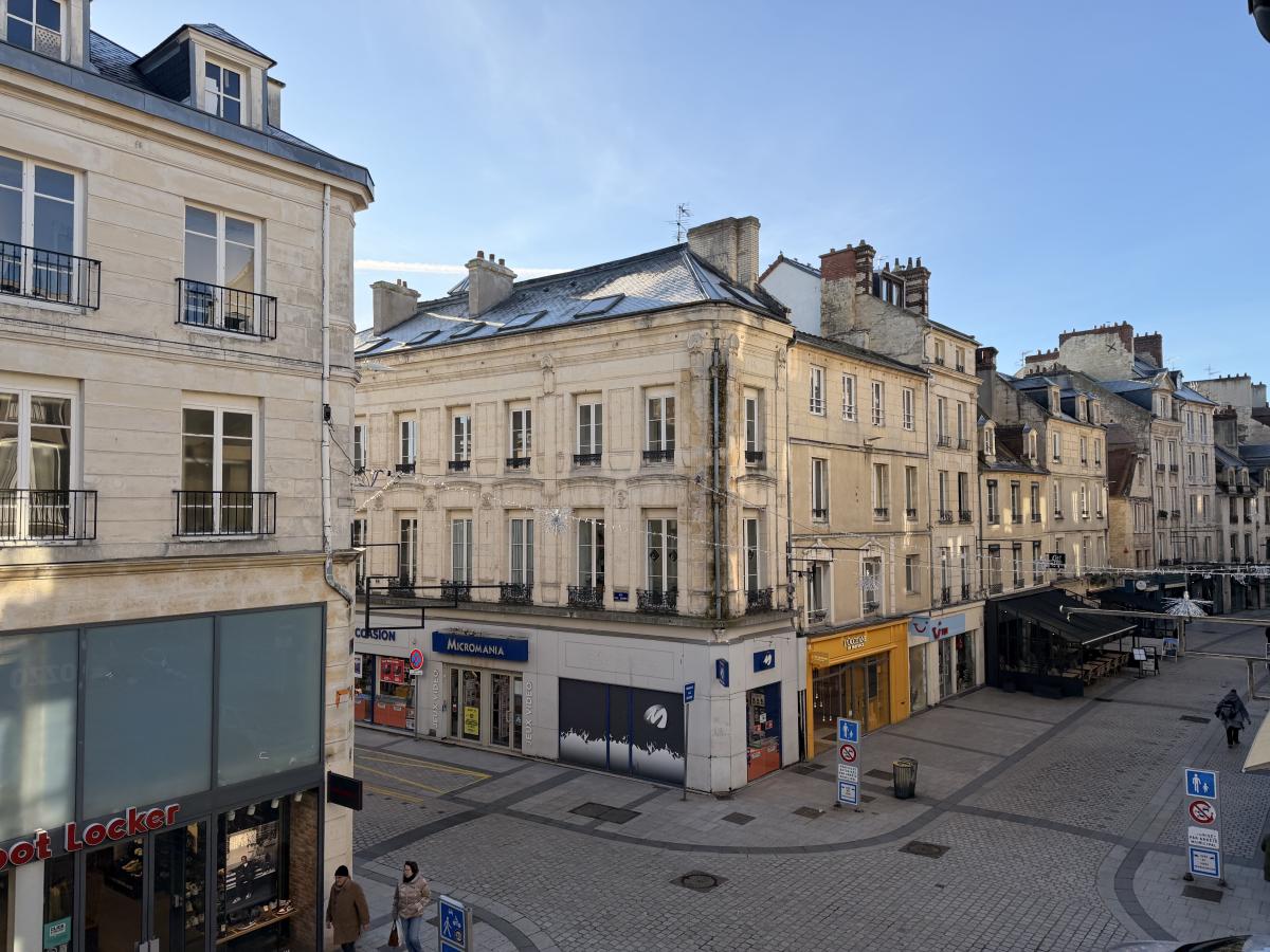 Rue Saint Pierre, en plein centre historique de Caen, appartement de trois pièces principales situé au 2ème étage sans ascenseur, comprenant entrée sur séjour avec cuisine ouverte, dégagement, wc, salle de bains, deux chambres sur cour au calme. Une cave. Pas de parking.