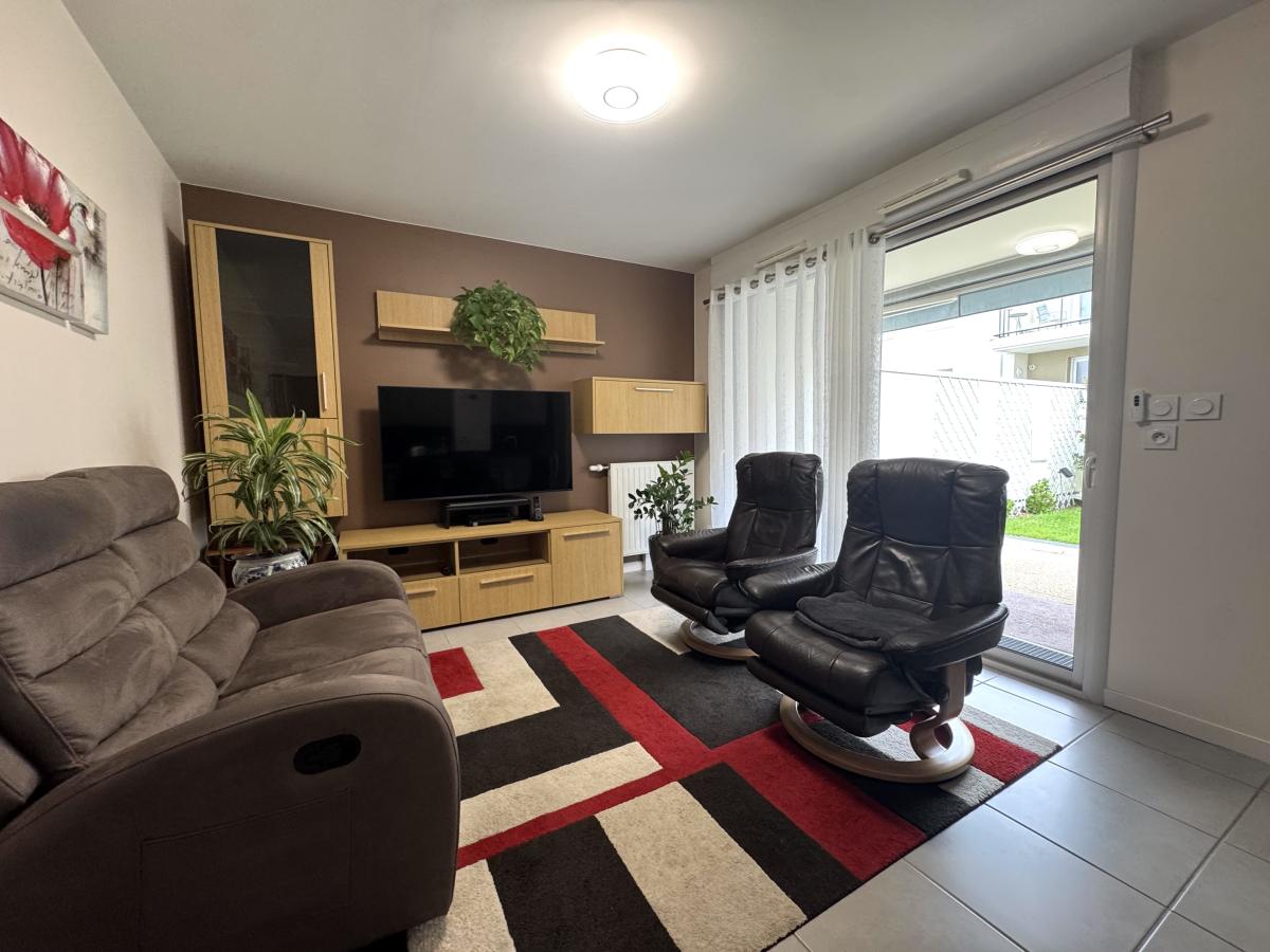 L’appartement se compose d’une entrée avec placards, de deux chambres, d’une salle d’eau et d’un WC indépendant. Vous trouverez également une cuisine aménagée et équipée ouverte sur une pièce de vie lumineuse, donnant directement accès à une terrasse et à un jardin privatif d’environ 75 m², idéal pour profiter des beaux jours.