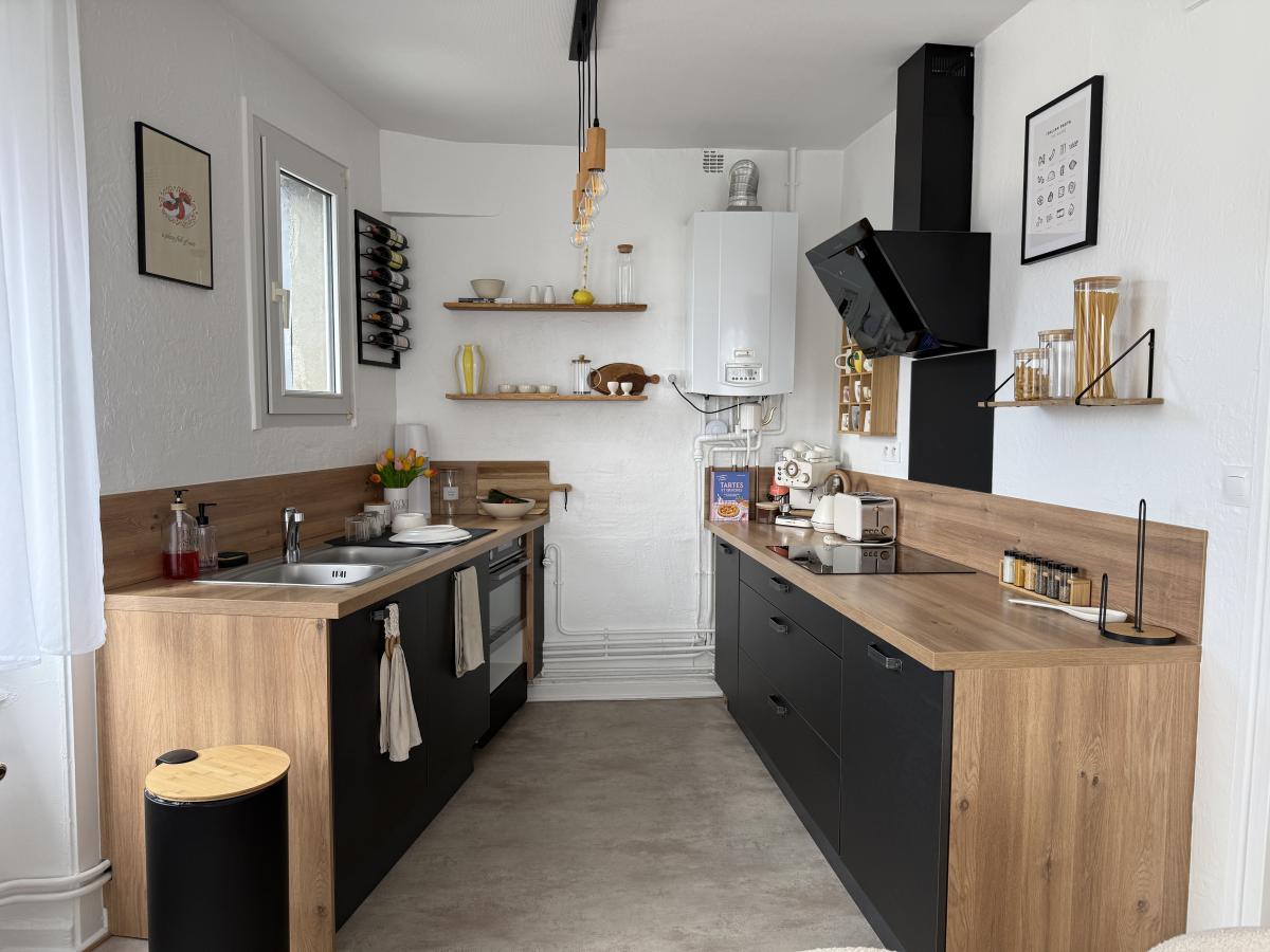 - Couloir d’entrée, cuisine aménagée ouverte sur séjour, deux chambres, salle de bains, WC, débarras.