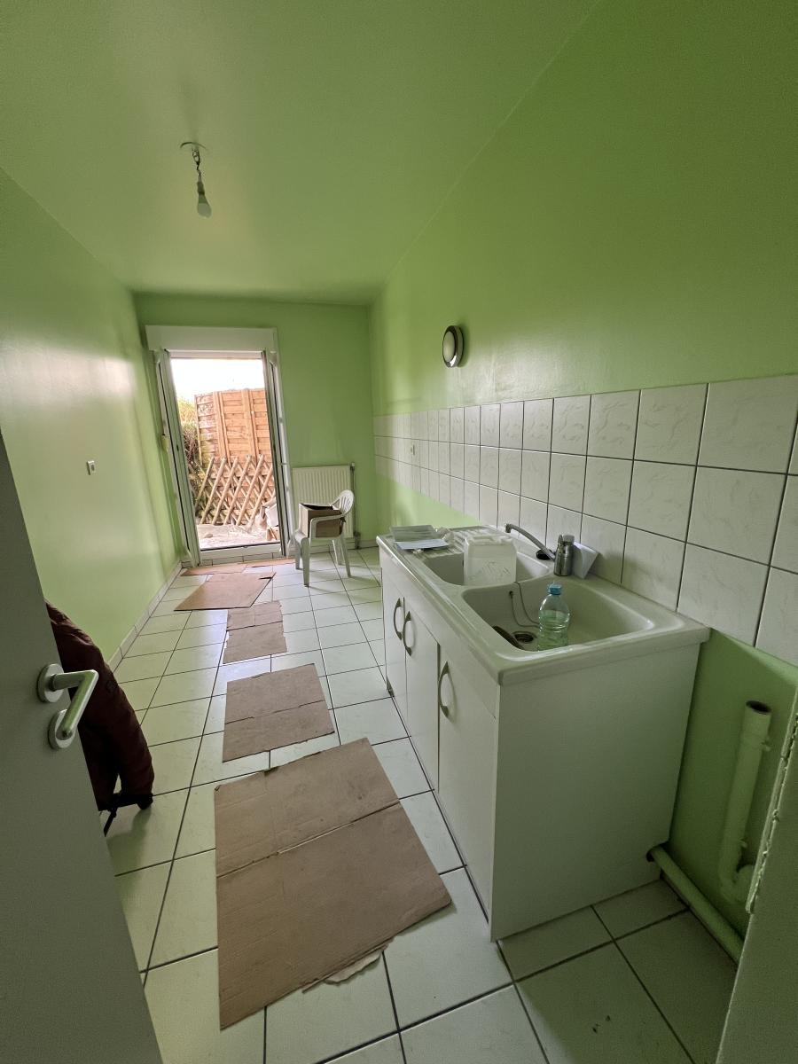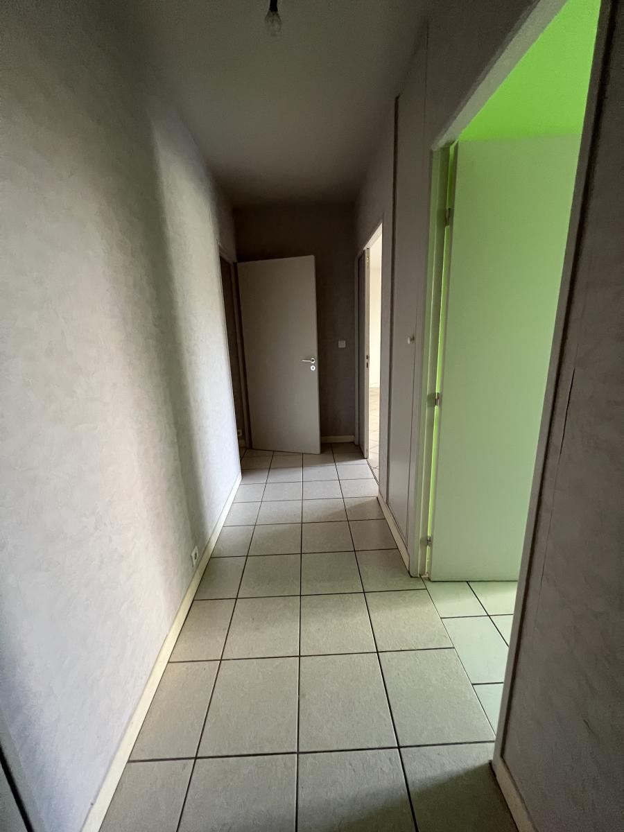 Une entrée avec placard, un WC, une cuisine, un séjour, un salon, un petit couloir desservant une salle de bains, une chambre.