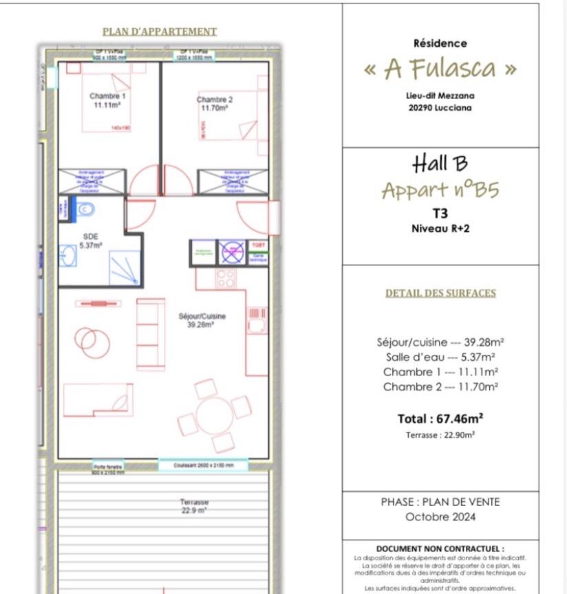 Neuf, haute Corse, entre mer, rivière et montagne, cet appartement de type 3 de 67,46m2 avec terrasse de 22,90m2 est vendu sur plan. Il se situe au deuxième et dernier étage d'une petite résidence arborée et à proximité des commerces. Il comprend une vaste pièce à vivre de 39,28m2 communiquant sur une terrasse de 22,90m2 exposée sud ainsi que deux chambres et une salle d'eau. Il bénéficie aussi de deux places de stationnement. Idéal pour un logement principal, secondaire ou un investissement.