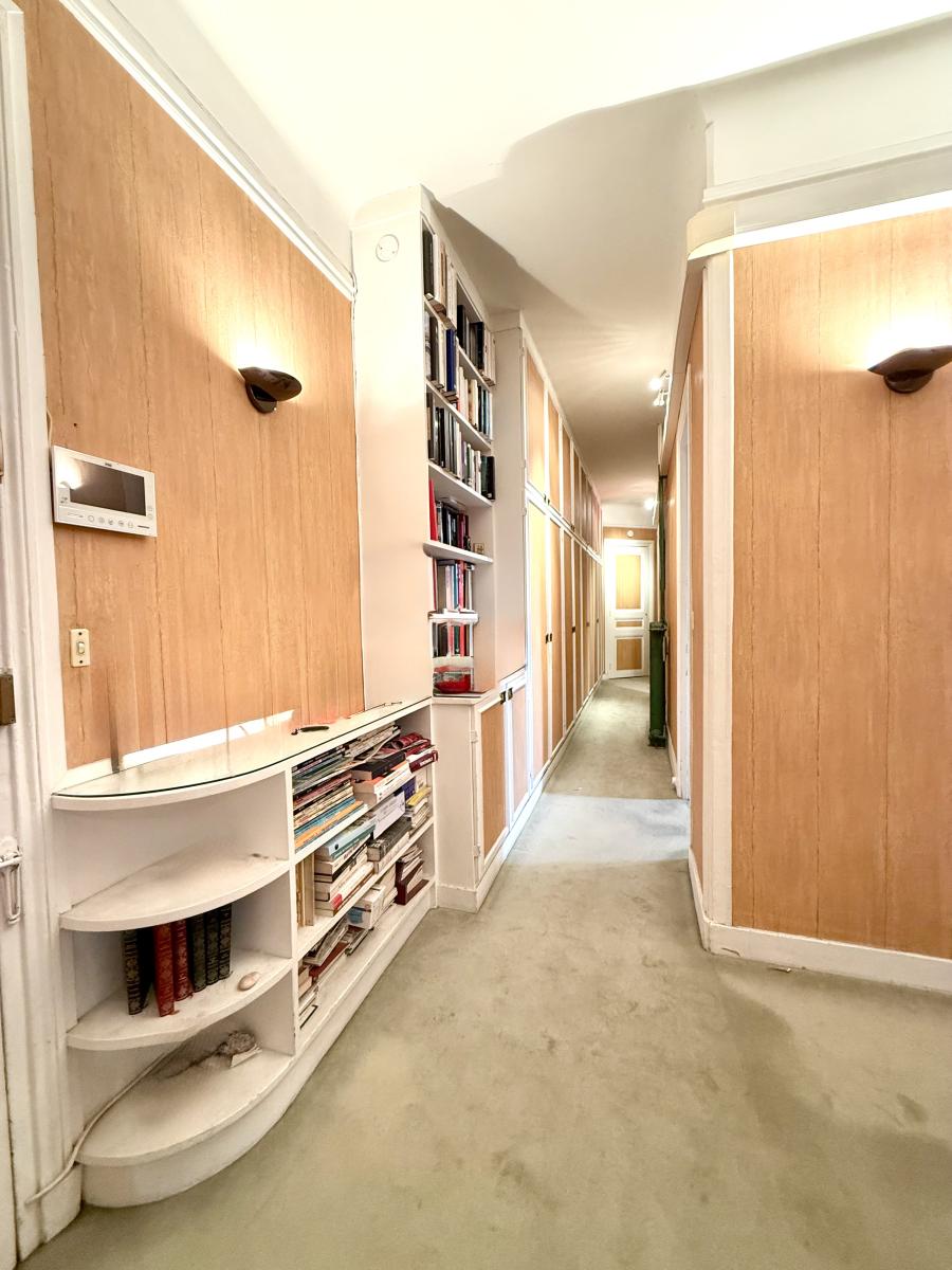 Belle hauteur sous plafond, couloir avec de nombreux rangements et un cagibi.